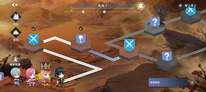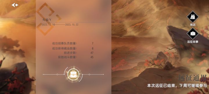 如图1、2,第一周就能稳过火山60级打满奖励(甚至于最终BOSS都没撑过1回合就倒了)。如图3、4、5、6所示此方法不需要什么练度(本人主队抗争队,把主队边角料材料拿出来养的这四个角色,没什么练度,音域完全没有觉醒过,数值也都很低,基本只是拉满了等级。)下面详述一下过关重点——核心想法就是多开路线中的宝箱(火山一共8个宝箱,本人一次过没有重来过,开出6个),多拿藏品,图7、8、9所示为本人通关