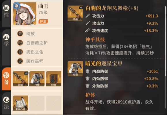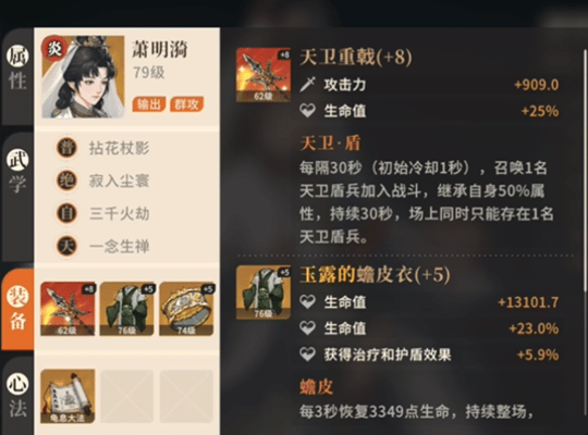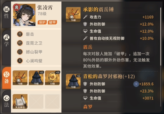 辅助:张凌霄心法:天龙神功获取方式:夜晚潜入灵海寺窃取和尚的天龙神功残页,每天可获取1个,消耗10个残页合成;首次潜入还能在莲花池旁的崖边跳崖获取1个心法属性:外防百分比>生命百分比>生命>外防>其他核心装备武器:承影的震岳锤【燕京】现世支线任务「披云向日」获得核心装备护甲:森罗封邪袍副本「黑刹教」·普通·天煞血狂核心装备饰品:暗光的曜晨佩【开封】天卫军势力任务「天军斗阵」获得小