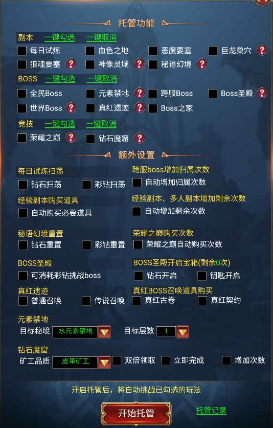 怕日常繁多的小伙伴们注意了,游戏内可是有挂机助手功能的。托管功能细化了,不仅包含副本、BOSS、竞技等还有额外设置,可以根据个人习惯进行设置。真正意义上的解放双手,轻松游戏!托管功能位置:游戏界面-特权卡-挂机助手#封天战神 #游戏日常 #发现好游戏