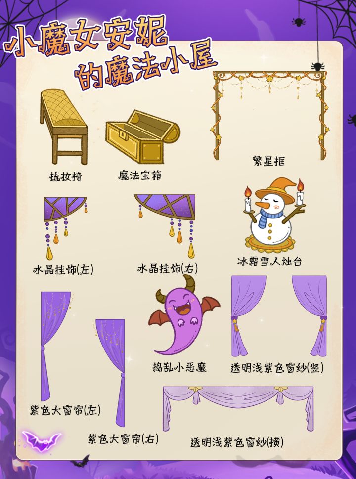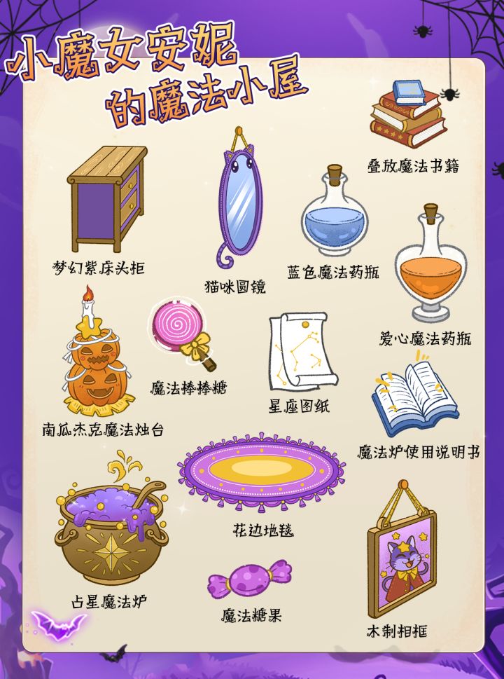 🎃Yingfinite无垠X @阿鹏Peng 联动套装——《小魔女安妮的占星小屋》!⭐万圣节刚结束,就收到小魔女安妮的邀请,去她家参观她的占星小屋。😈既然如此,小垠的坏点子生成中—— “不给糖,就捣蛋!”👀房门缓缓打开,小魔女安妮望着面前提着糖果篮的小垠,皎洁一笑,将人带入房间,“那就进来捣蛋吧!”紫色的房间映入眼帘,紫色床铺躺着戴星饰的飞天小猫,魔法锅冒着星星泡泡,雪人