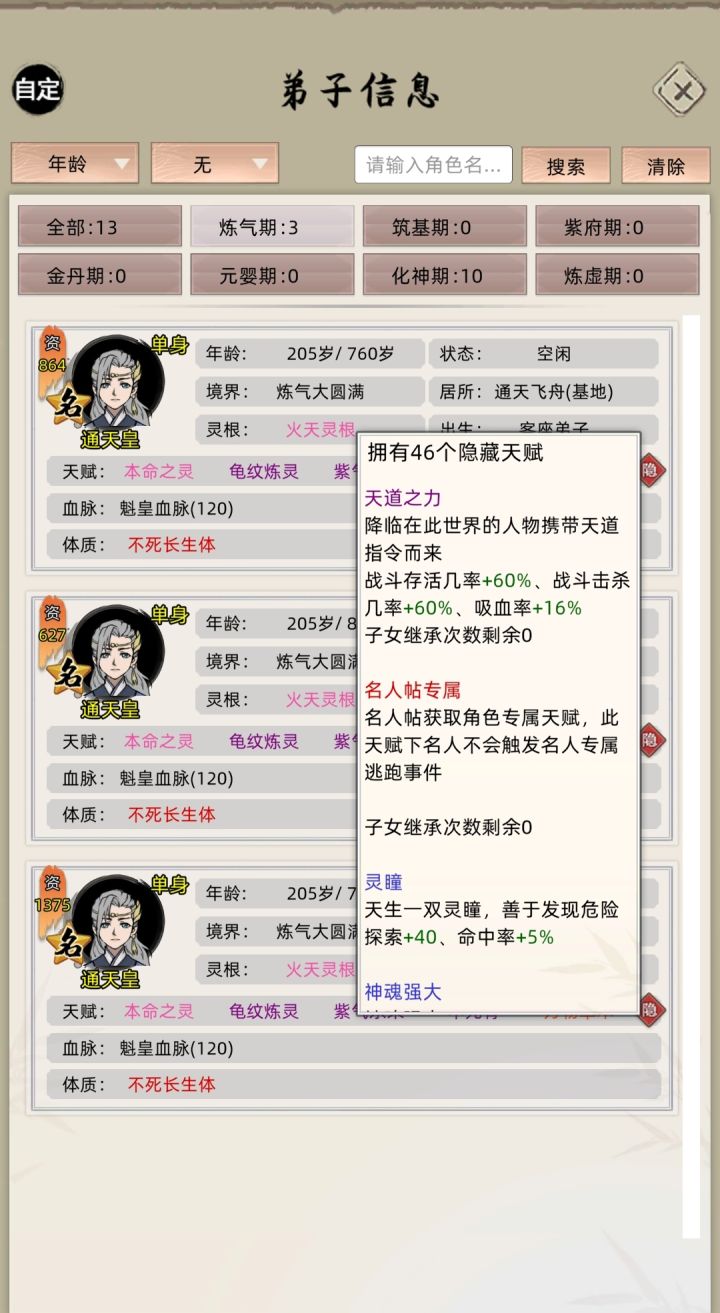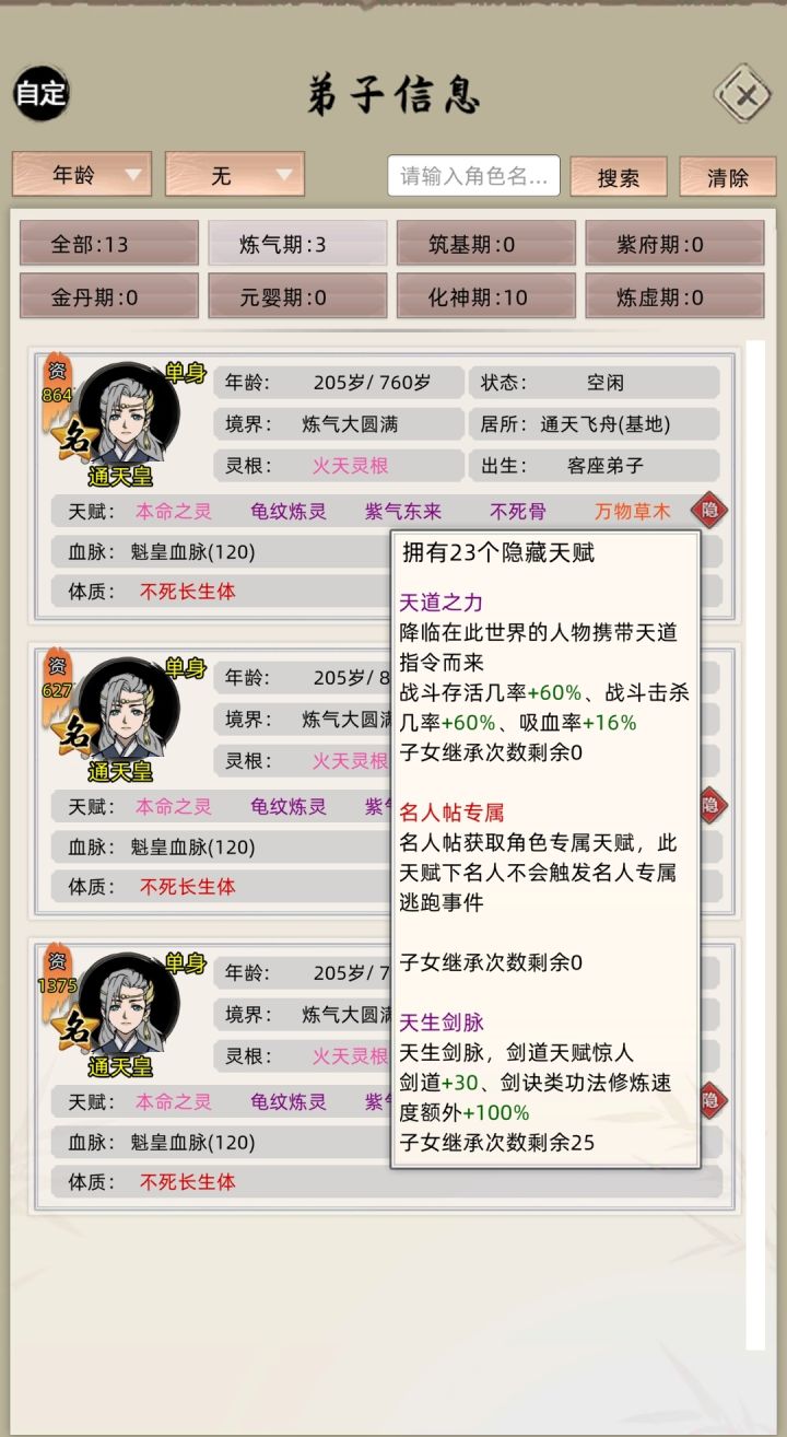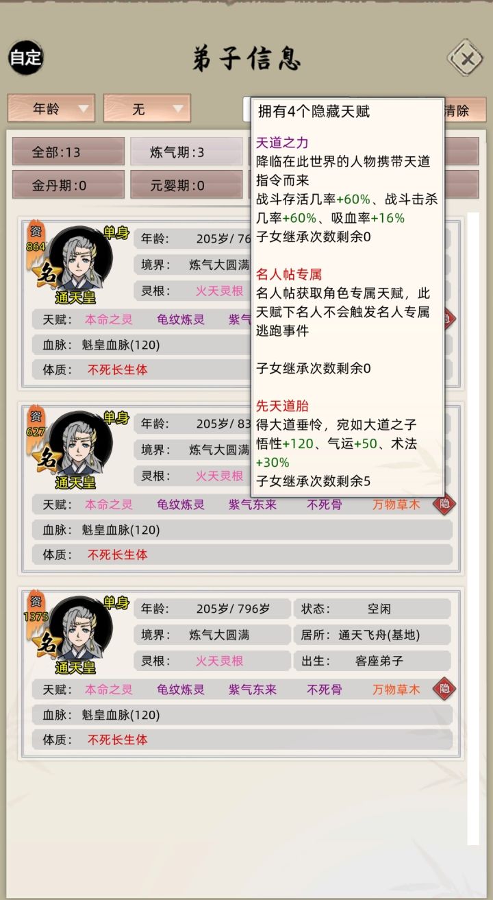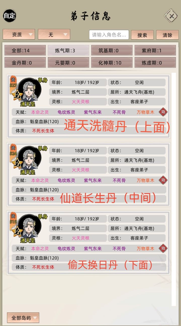 顺序还是一样的,测试后偷天换日丹天赋上限为46个,仙道长生丹只有2个天赋只能用一次(登仙台俩红天赋),通天洗髓丹天赋上限有限(这里测试最高在23个),所以这样玩的话,名人最高有2000资质左右。#修仙家族模拟器 #小妖游戏解说