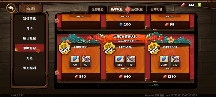 新春礼包不如活动礼包新春值800的340礼包:90卷➕700砖石=100卷➕100砖石活动值650的30礼包*11=330:110卷➕330砖石换算成卷 活动礼包比新春礼包多10卷和230砖石 还便宜了10红砖石策划赶紧补偿我999999999抽#小小军团重