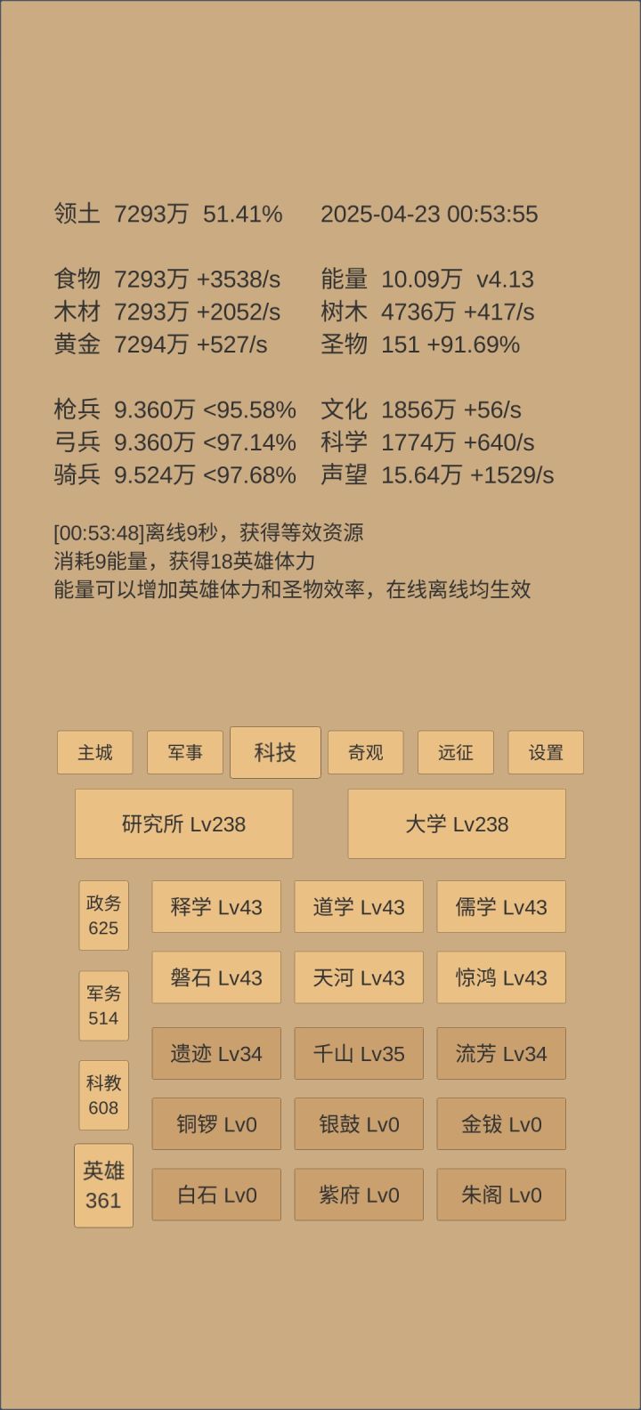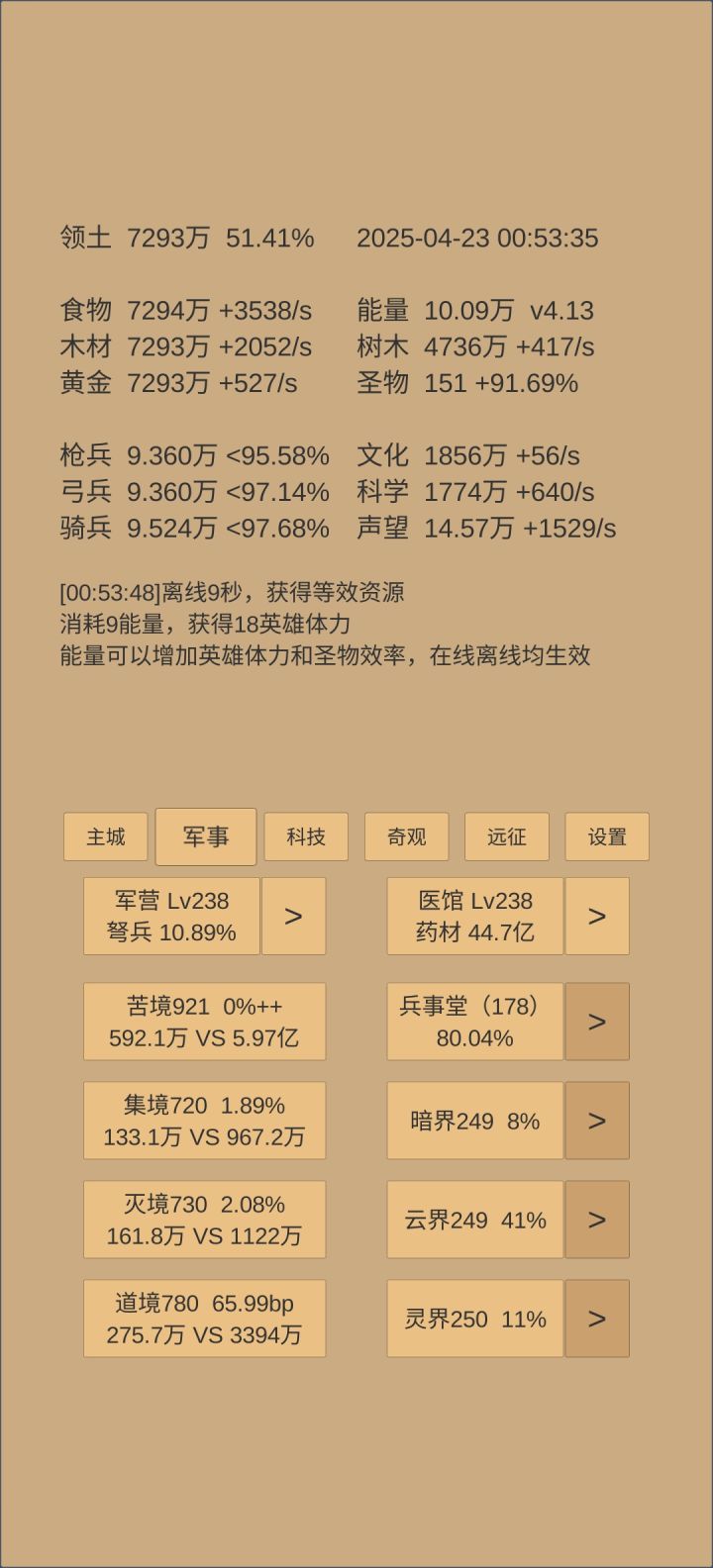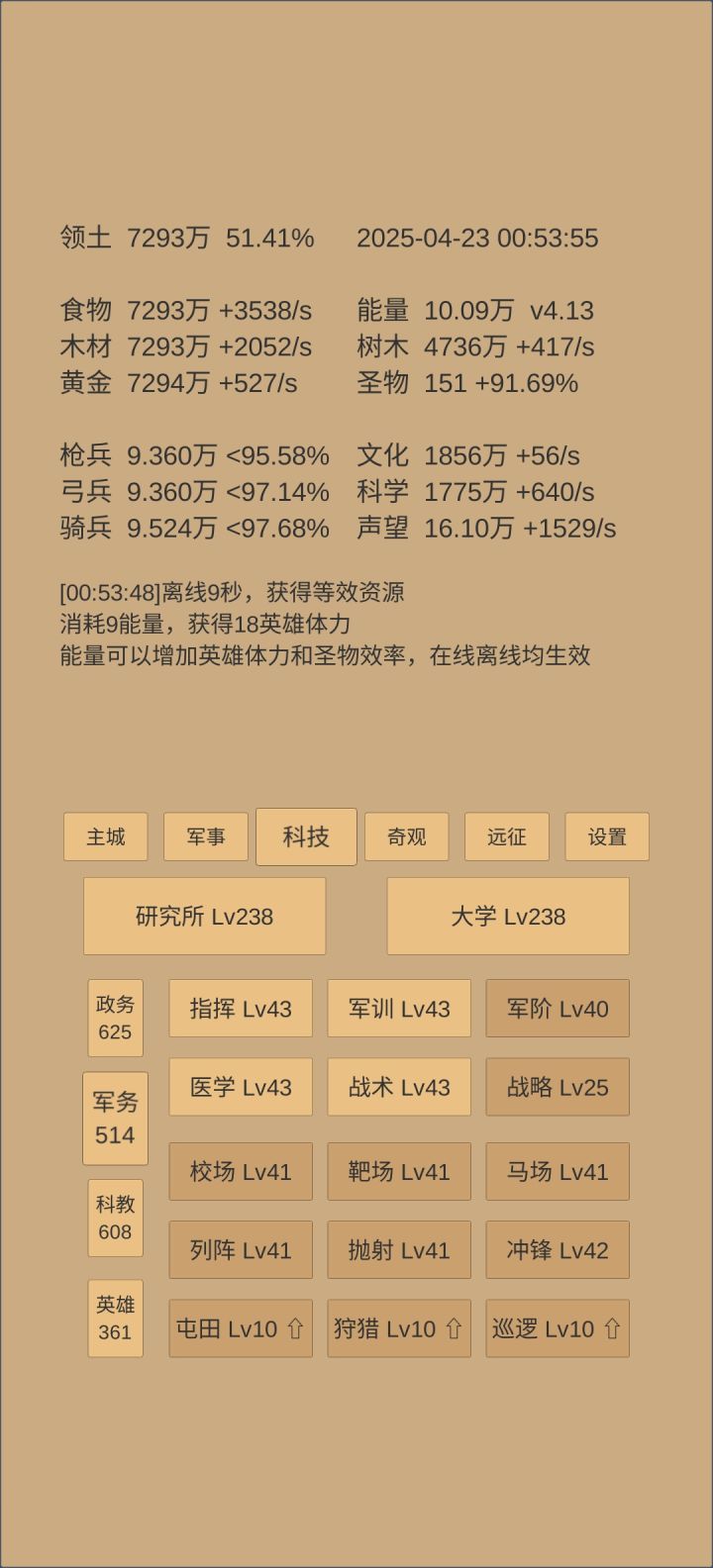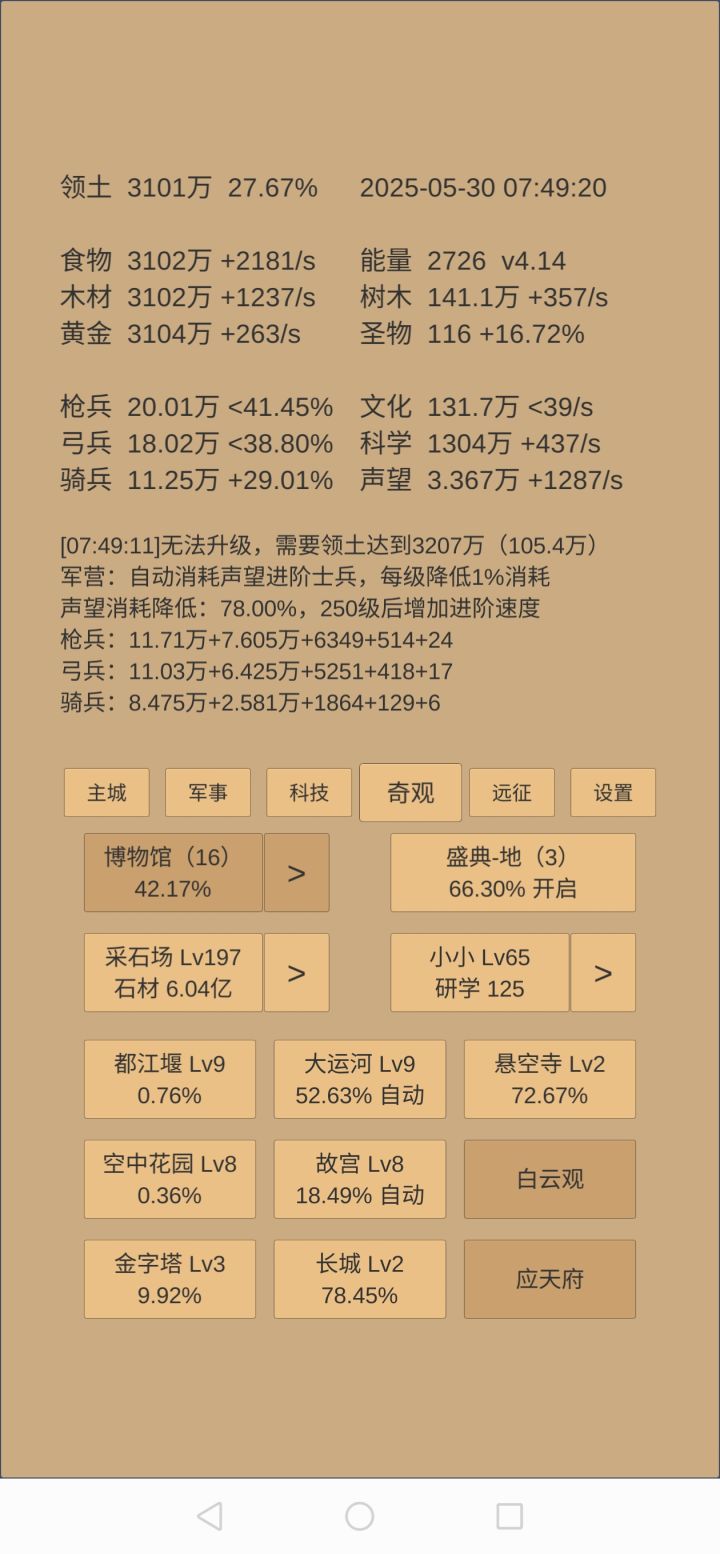 三、新手期新手期的范围是从开启“科技”之后到开启“奇观”,也就是拥有300万领土为止。当然从广泛意义上讲,还可以延长到“异界来客”(奇观页)——英雄小小的开启,所以新手期就分成两部分来讲述。(一)奇观(本二级标题下引号均指科技页内的科技)奇观的需求是300万领土,一般说来,时间从上线期结束到开启奇观的要求从5-20天不等。领土是唯一的硬性要求,而我们依然沿用上线期的结论,主要依靠三境征讨,其