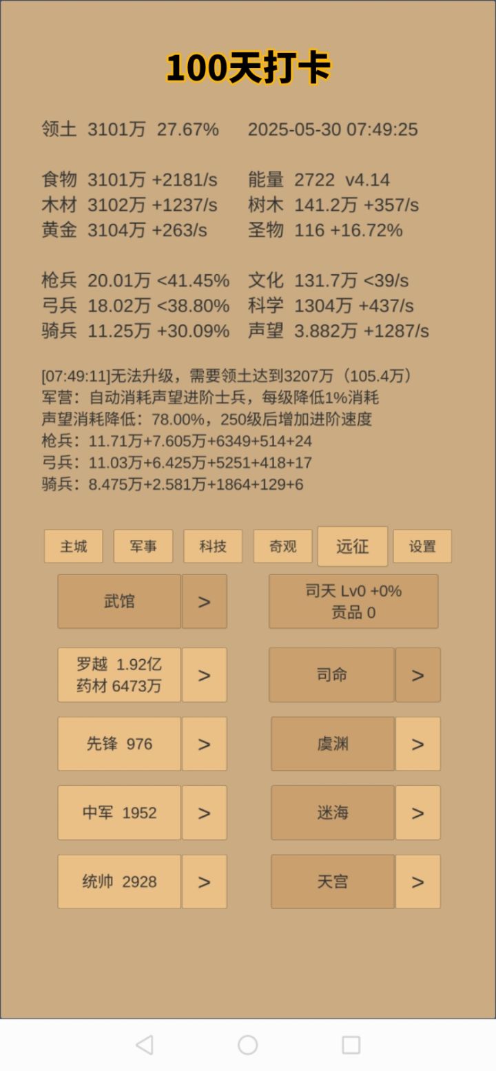 100天完成开远征,19成就,兵不在多够用就行,升级科技唯有用幸,经济建设为中心#小小城邦