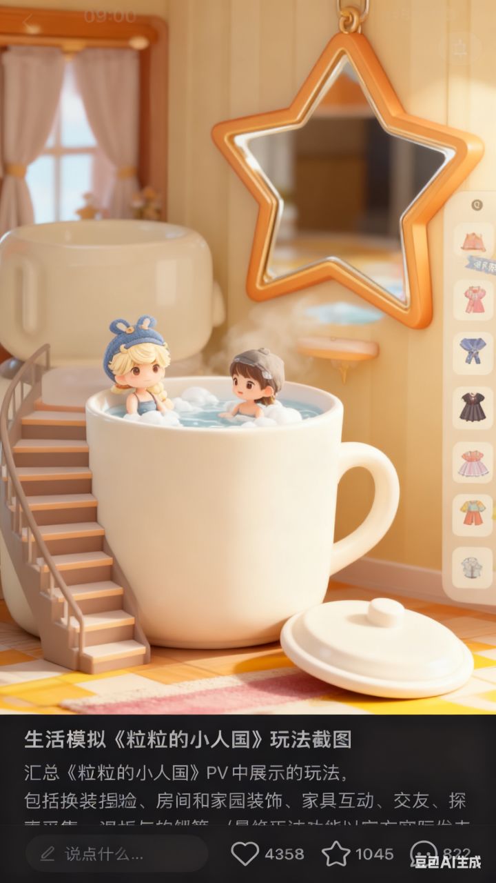 🌿清晨|在蒲公英森林里建造会呼吸的房子在绒毛般的蒲公英丛里跳舞,让糖霜似的花粉引导出道路并跟着萤火虫走向家园。把捡来发光瓶盖当窗户,七彩吸管搭成旋转滑梯,牛奶盒剪成波浪形屋顶。当粒粒们好奇地戳墙壁时,整个房子会像云朵一样轻轻晃动,从烟囱里飘出棉花糖的香气。💦上午|在洗手池举办水滴奥运会站在牙膏杯跳台上,纵身跃入泛起涟漪的洗手池。参加的项目有:薄荷叶冲浪、肥皂划艇赛,还会被突然出现的泡泡先生托