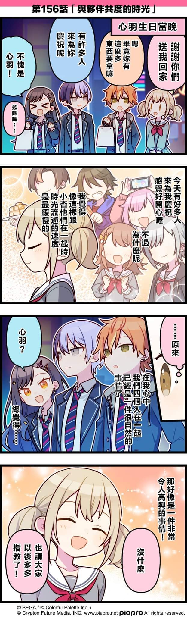 【「世界」劇場 四格漫畫】 尊敬的各位居民:今天3/2是Vivid BAD SQUAD成員「小豆澤心羽」的生日!讓我們一起來慶祝心羽的生日吧~來看看關於小豆澤心羽的小故事吧~第156話「與夥伴共度的時光」🎉#pjsk #世界计划 #小豆泽心羽 #VBS