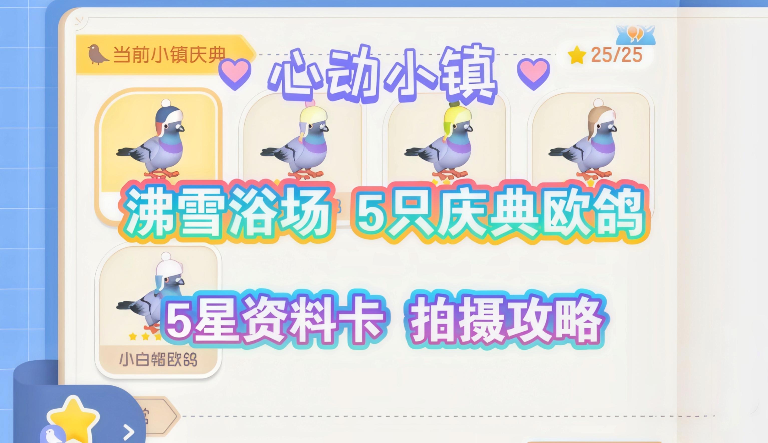 △5星舒展动作展示△ 沸雪浴场共有5只欧鸽: 小蓝帽欧鸽】、【小粉帽欧鸽】、【小绿帽欧鸽】、【小棕帽欧鸽】以及【小白帽欧鸽】】 5星拍摄条件:(下雨天和彩虹天) 4星舒展动作 + 1星完美成像 完美成像: 观鸟爱好4级 取景框居中 距离2-4m 舒展动作: 观鸟爱好6级 #心动小镇 #心动小镇沸雪浴场 #小镇庆典沸雪浴场 #心动小镇攻略 #心动小镇日常