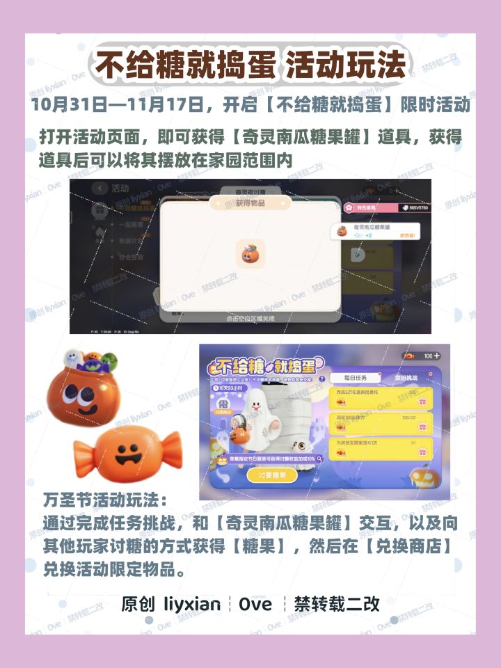 10月31日至11月17日,开启万圣节【不给糖就捣蛋】限时活动。 玩法攻略、2套新服装、3个新食谱、宠物装扮,家具摆件,新单人动作。 #心动小镇 #心动小镇陇上金颂 #小镇庆典陇上金颂 #心动小镇攻略 #心动小镇日常