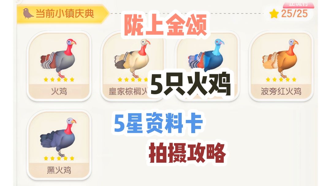 △5星舒展动作展示△ 陇上金颂共有5只火鸡: 【火鸡】、【皇家棕榈火鸡】、【眼斑火鸡】、【波旁红火鸡】、【黑火鸡】 5星拍摄条件:(下雨天和彩虹天) 4星舒展动作 + 1星完美成像 完美成像: 观鸟爱好4级 取景框居中 距离2-4m 舒展动作: 观鸟爱好6级 #心动小镇 #心动小镇陇上金颂 #小镇庆典陇上金颂 #心动小镇攻略 #心动小镇日常