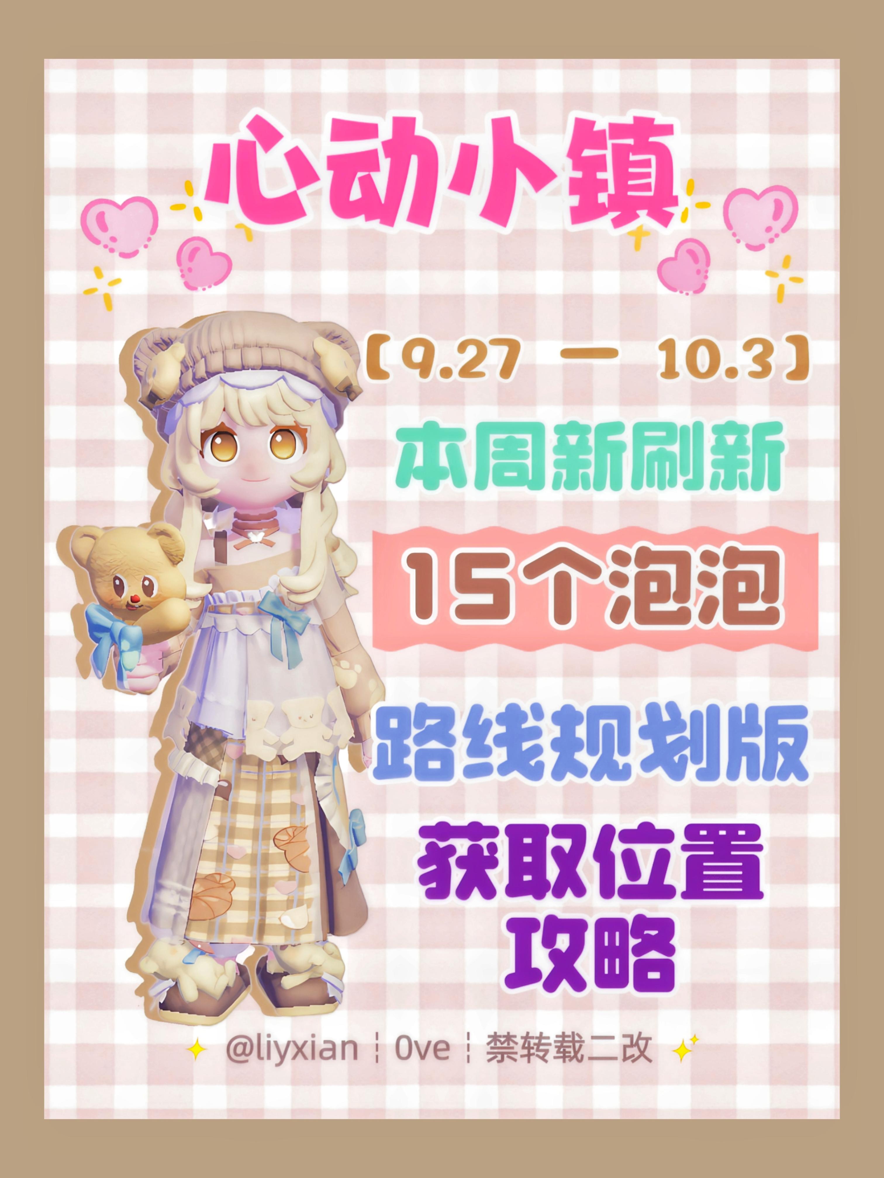 9.27 — 10.3,本周新刷新的15个粉色泡泡获取位置。 路线规划版。 陇上金颂 攻略、秋游计划 谜面泡泡位置、每日溜溜橡木和无瑕萤石 位置、每日兑换码等攻略都在主页哦。 #心动小镇 #心动小镇陇上金颂 #小镇庆典陇上金颂 #心动小镇攻略 #心动小镇日常