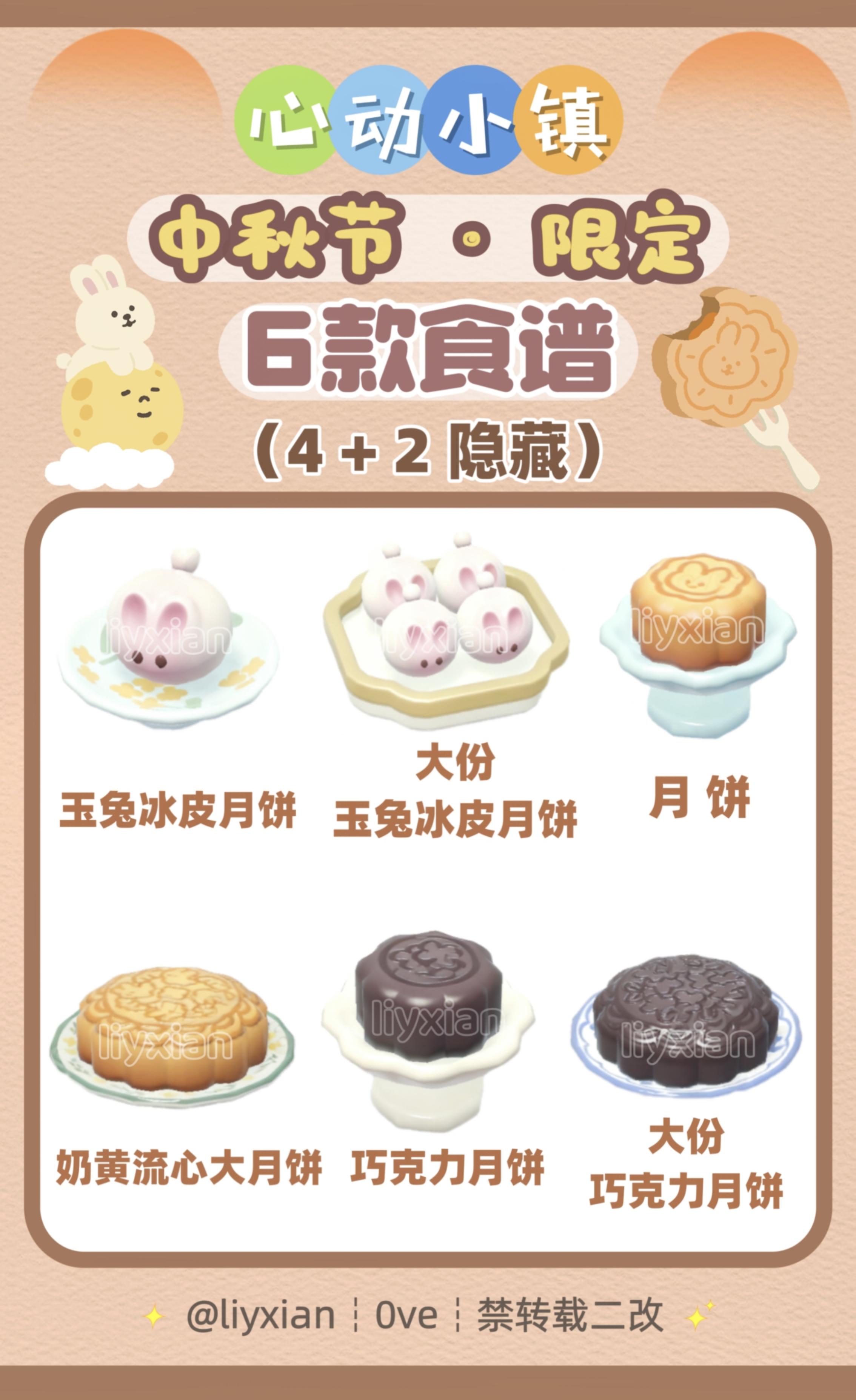 4款可购买的限定食谱: ① 新食谱:【玉兔冰皮月饼】和【大份玉兔冰皮月饼】 ② 返场食谱:【月饼】和【奶黄流心月饼】 △ 4款食谱均可在日常炉具中烹饪 △ 其中: 使用【月饼】和【奶黄流心月饼】食谱 替换食材,可以制作出隐藏食谱【巧克力月饼】和【大份巧克力月饼】。 #心动小镇 #心动小镇陇上金颂 #小镇庆典陇上金颂 #心动小镇攻略 #心动小镇日常
