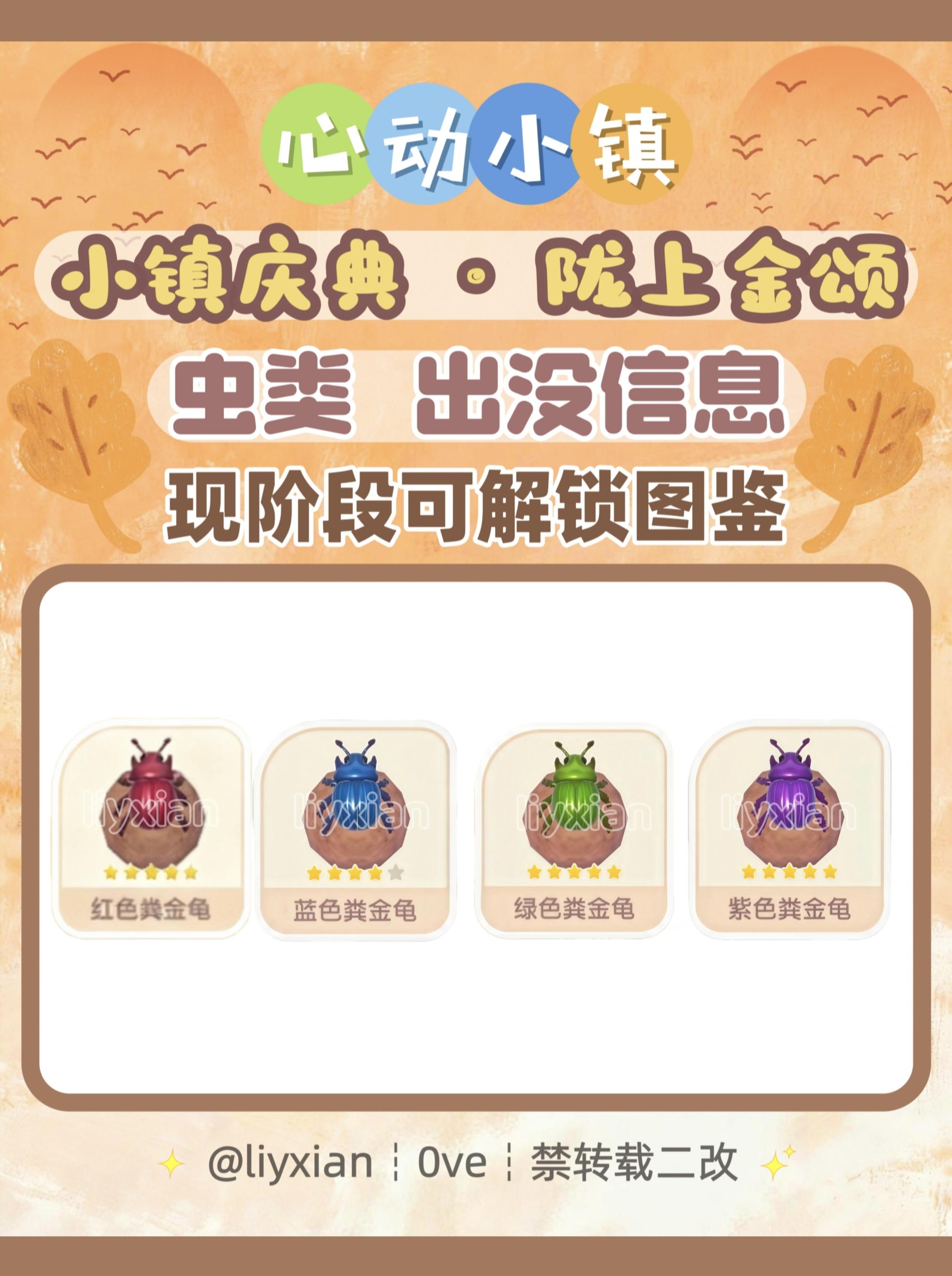 陇上金颂 4种现阶段可解锁限定虫类: 【红色粪金龟】、【蓝色粪金龟】、【绿色粪金龟】以及【紫色粪金龟】 第5种限定虫类目前暂时获取不了,需要在第二周生态平衡事件中才能获取。 #心动小镇 #心动小镇陇上金颂 #小镇庆典陇上金颂 #心动小镇攻略 #心动小镇日常