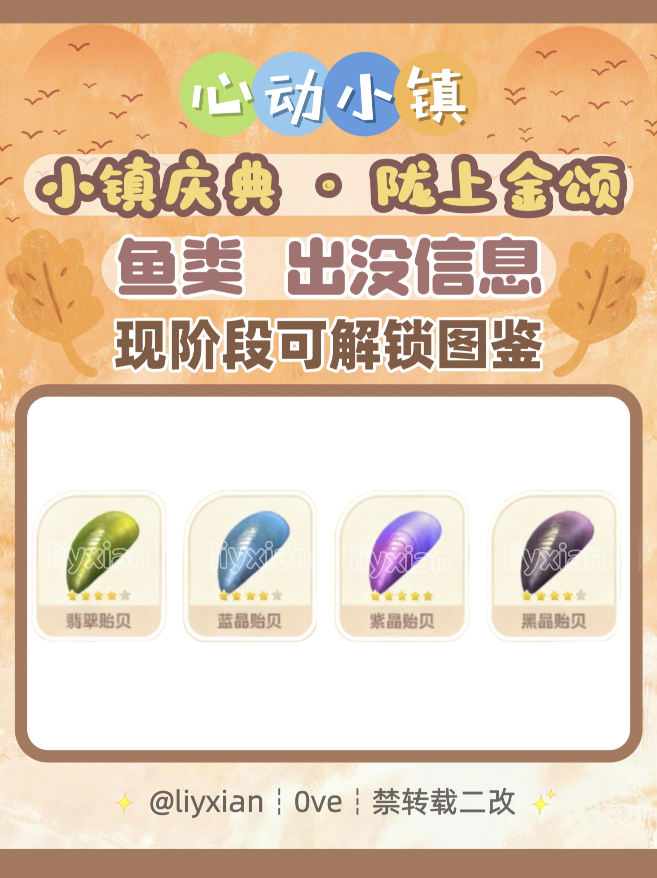 陇上金颂的限定鱼类,均可在【城郊湖】获取。 4种目前可解锁的限定贝类: 【翡翠贻贝】、【蓝晶贻贝】、【紫晶贻贝】以及【黑晶贻贝】。 第5种贝类目前暂时获取不了,需要在第二周的丰收贻贝事件中才能获取。 #心动小镇 #心动小镇陇上金颂 #小镇庆典陇上金颂 #心动小镇攻略 #心动小镇日常