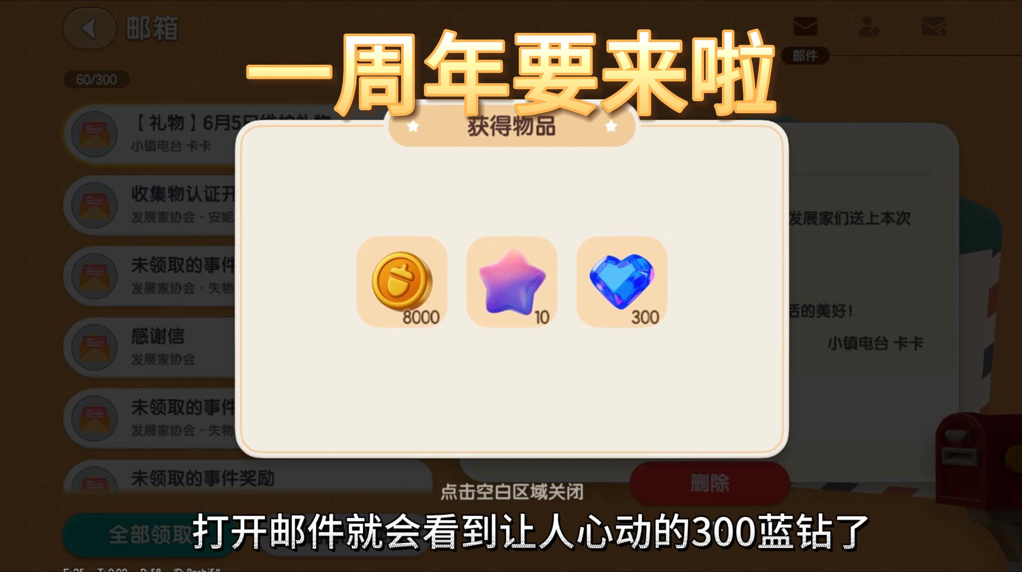 这个300蓝钻也预示着小镇的一周年来到的一个前期庆祝吧。迎来了一个大更新。 所以大家记得去更新完后,在邮箱里面就能领取了哦,人人有份永不落空啦。 #小镇稚趣 #小镇稚趣园 #小镇童趣时刻大比拼