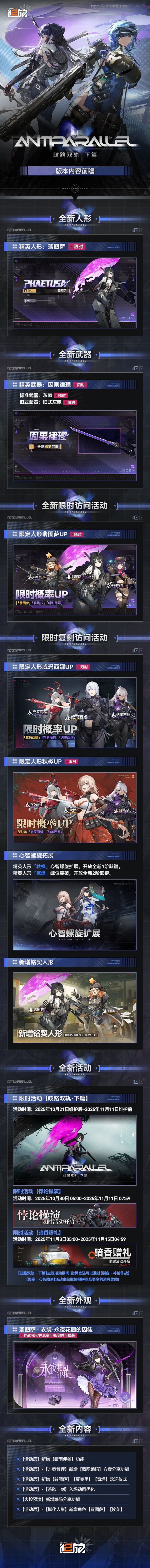 10月21日维护后,版本活动【歧路双轨·下篇】正式开放! ♦ 精英人形「翡图萨」&精英武器「因果律理」上线 ♦ 全新外观翡图萨<衣装·永夜花园的囚徒>版本更新后上架 ♦ 累计签到7日领取【专访许可*10】 ♦【开拓之路·第三期】【逃离废墟·第五期】活动将陆续上线 ♦【功能新增丨晴雨便签】【功能新增丨蓝图编码】【功能新增丨拟化人形-翡图萨&埃芙】【功能优化丨欢迎仪式-翡图萨&夏克里&奇塔】【功能优化