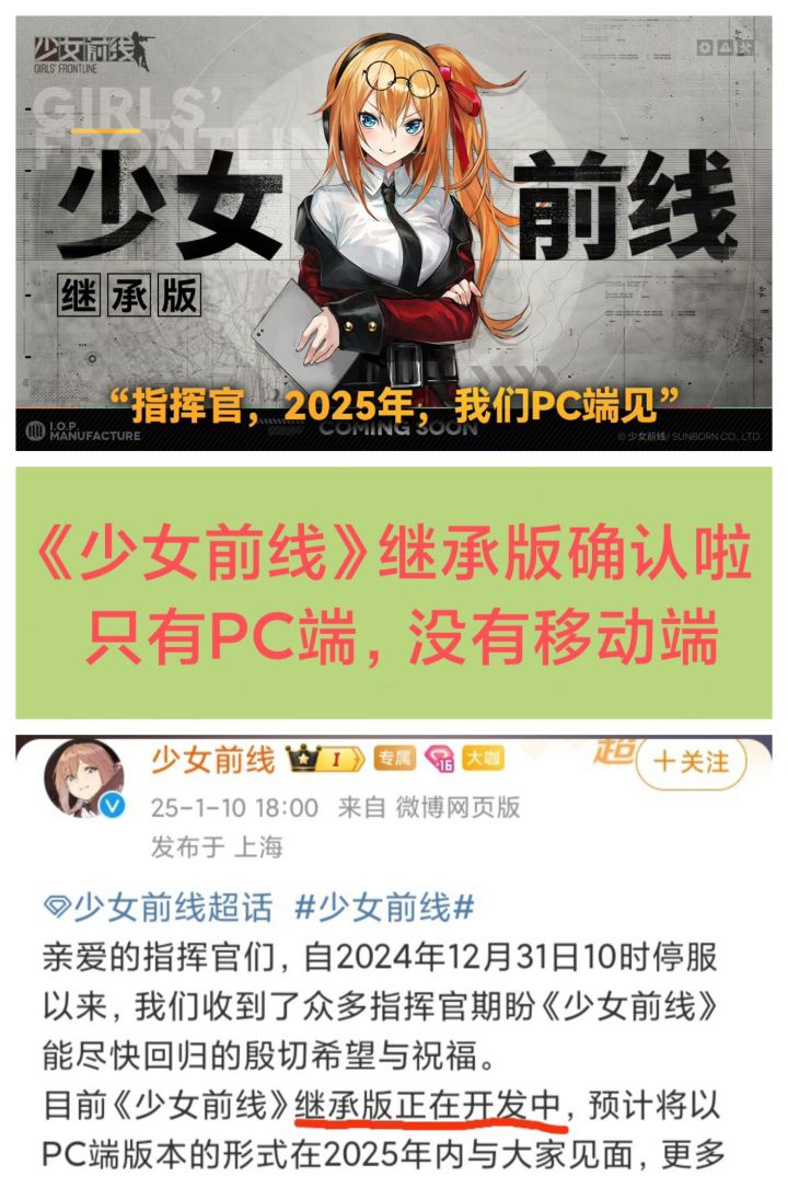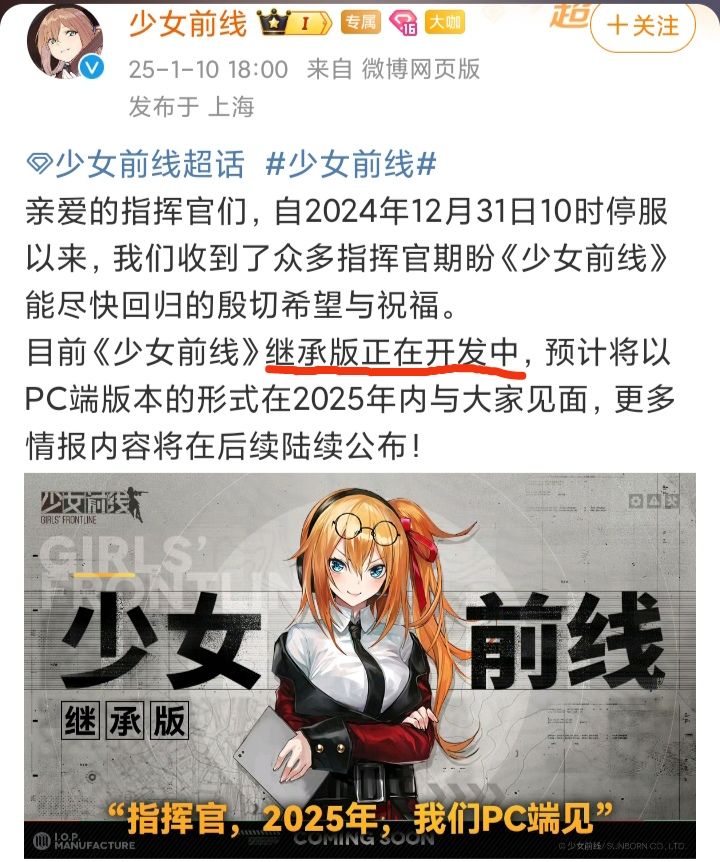 《少女前线》已于 2024 年 12 月 31 日 10 时正式停止运营,关闭游戏服务器。少女前线制作组云母组宣布,目前《少女前线》继承版正在开发中,预计将以 PC 端版本的形式在 2025 年内与大家见面#今天游戏圈发生了啥 #难说话说 #资讯评论员 #少女前线