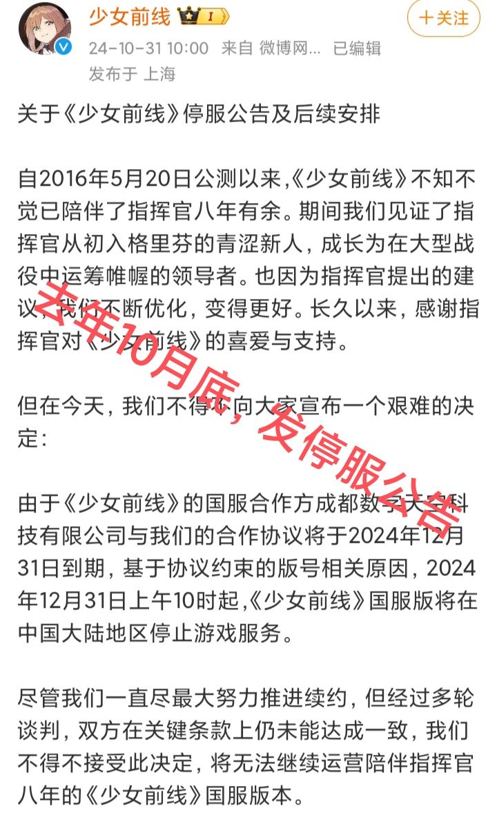 就在10.31号上午十点,运营了八年之久的少年前线发布停服公告。(点击查看大图) 由于《少女前线》的国服合作方成都数字天空科技有限公司与我们的合作协议将于2024年12月31日到期,基于协议约束的版号相关原因,2024年12月31日上午10时起,《少女前线》国服版将在中国大陆地区停止游戏服务。 尽管我们一直尽最大努力推进续约,但经过多轮谈判,双方在关键条款上仍未能达成一致,我们不得不接受此决定