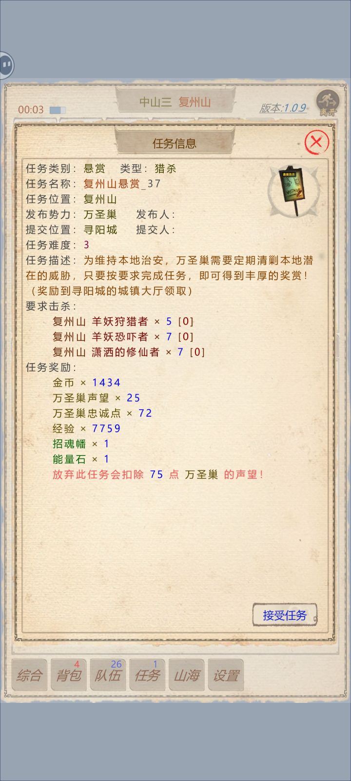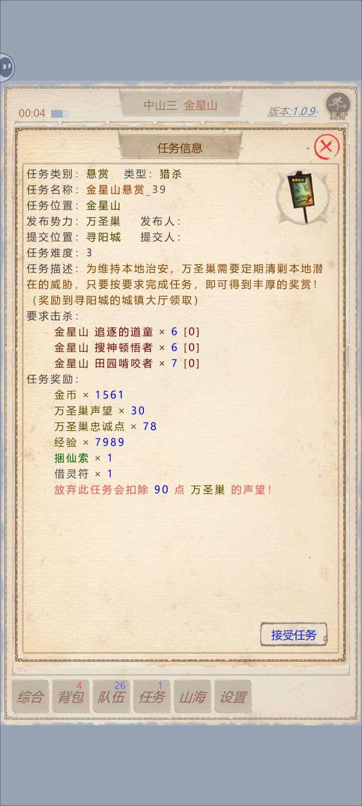 1.新手任务 捕捉野兽:抓狗(要品质白色的)拆解装备:白色以上的装备才可以拆解猴儿酒:主线任务总共需要两次猴儿酒(一个绿色的一个蓝色的)这个在城镇的合成道具里4合一就好任务类型分三种:捕捉(需要抓白色品质的) 剿灭(打之前记得把策略改成不流活口) 收集(建议挂个屠夫陈雄12级图里圣地跟深渊会刷)4个兑换码放评论区,需要的自取#山海奇闻2
