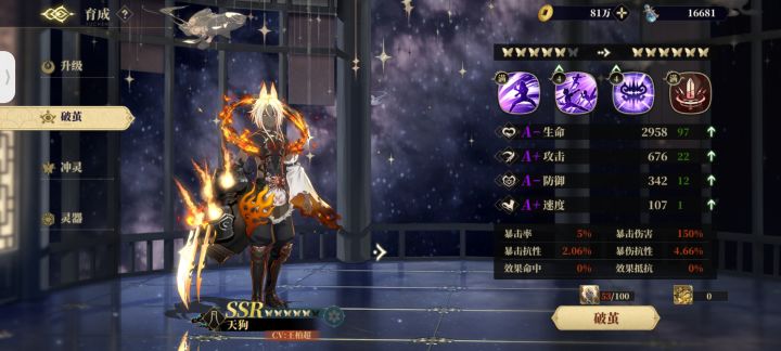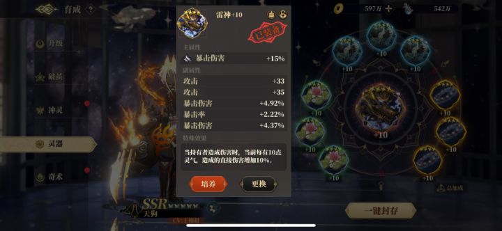 SSR直伤输出类镜灵:天狗(天狗镜花创造者):绝对的通关造化神卡,一蝶便足够通关三造化,爬塔在前面层数也很优秀。后面层数能够联动满蝶奢比天狐过反伤层,但是个人认为那是bug可能会被修复(帖子写到一半通知要修复了)直伤输出类的灵器佩戴都如下图所示,只有中间需要换,不过天狗在队伍中往往需要处于三速或者四速,开局一般是吃不满雷神增伤的,所以可以改成副词条更好的恒渊或者苍身,所以尽量保证灵器副词条有速