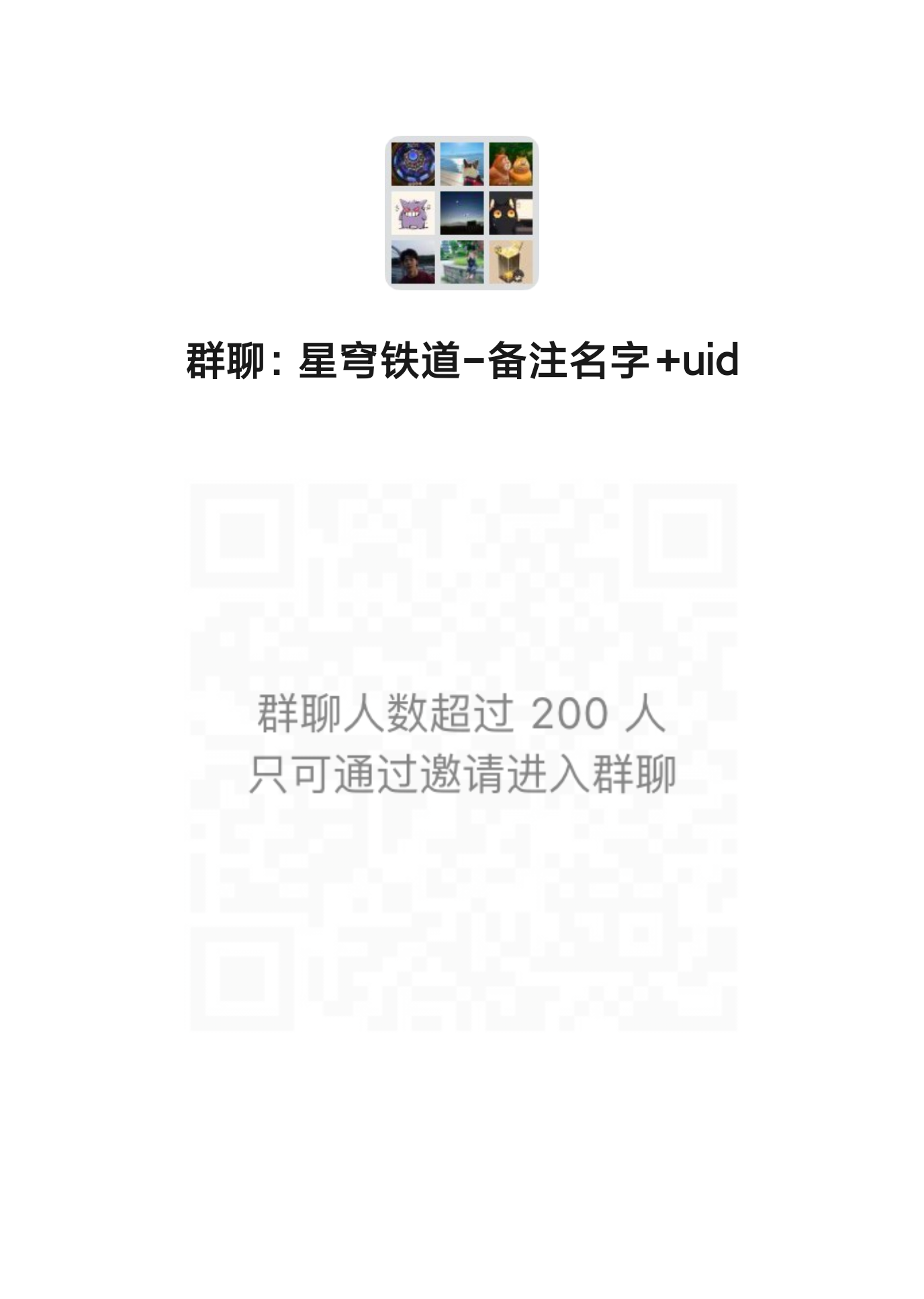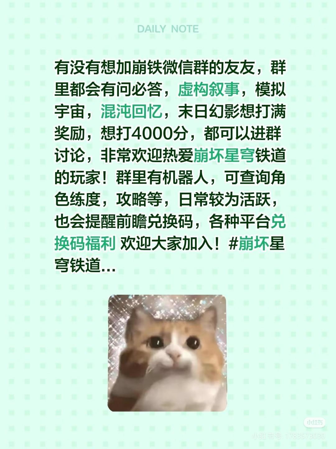 无论你是大佬还是萌新,欢迎加入我们大家庭,本群环境以及氛围都很好,基本是上班族以及大学生居多,无论你是大佬崩铁的高玩还是不会玩,群里都会有问必答,虚构叙事,模拟宇宙,混沌回忆,末日幻影想打满奖励,想打4000分,都可以进群讨论,非常欢迎热爱崩坏星穹铁道的玩家!群里有机器人,可查询角色练度,攻略等,日常较为活跃,也会提醒前瞻兑换码,各种平台兑换码福利 欢迎大家加入!#崩坏星穹铁道 #崩坏星穹铁道微信