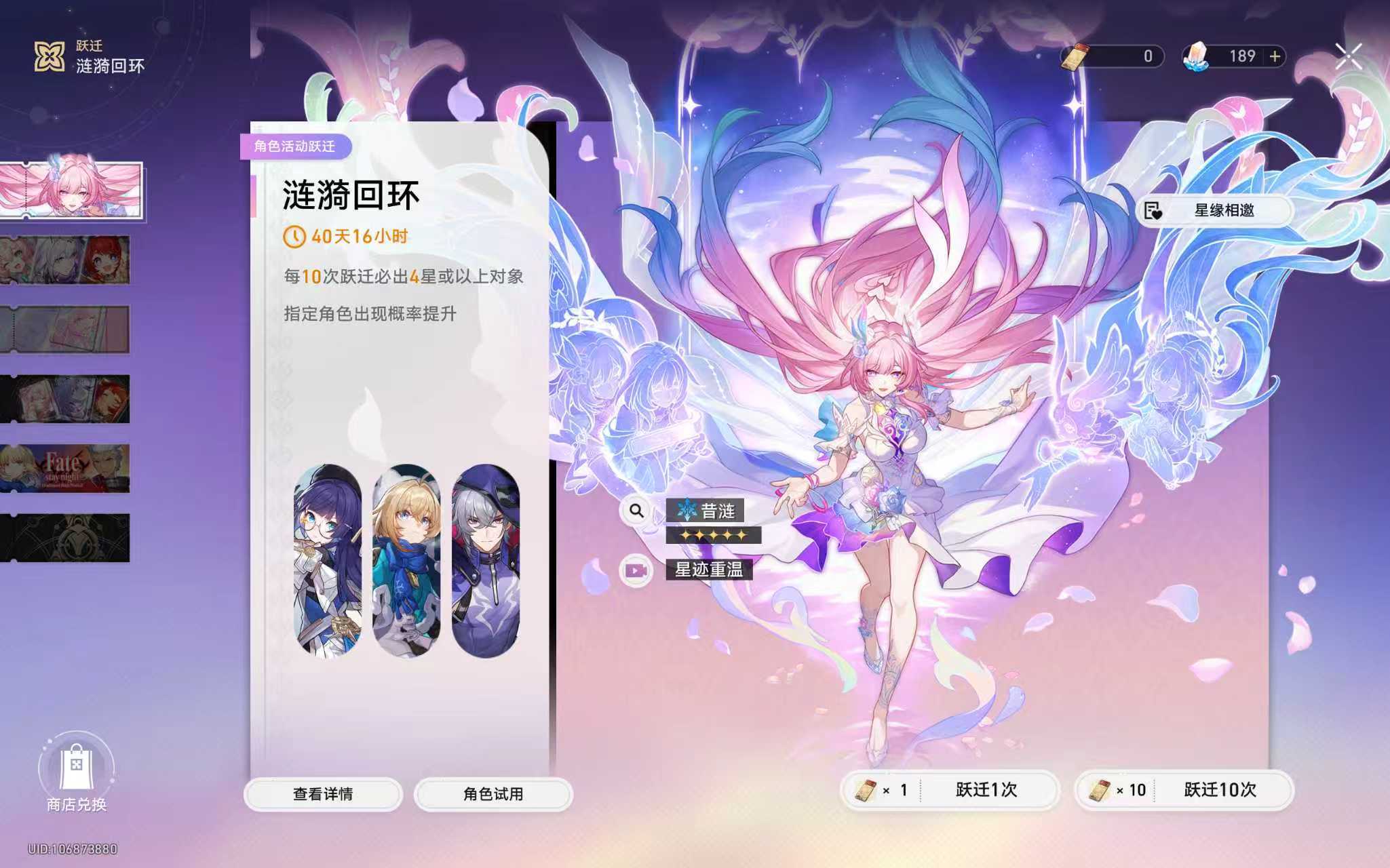 UID:104347362将将!摸鱼来啦!♡˖꒰ᵕ༚ᵕ⑅꒱马上开新卡池了,帮大家总结了一下整个版本的各种活动排期!昔涟的全版本卡池马上到来,联动卡池也将继续保留,冲鸭!【上半】限定5星:昔涟|复刻5星:风堇+遐蝶+缇宝陪跑4星:貊泽+玲可+佩拉—————— ฅ՞• •՞ฅ ———————【下半】限定5星:昔涟|复刻5星:白厄+赛飞儿+万敌陪跑4星:貊泽+玲可+佩拉——————