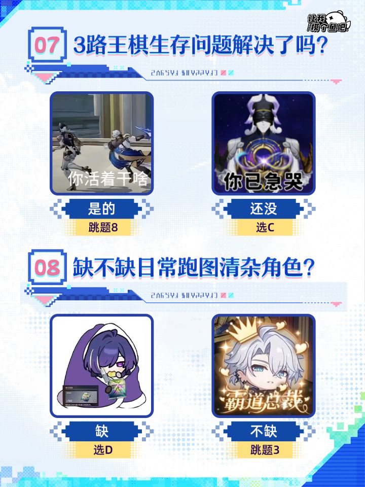 UID:104347362将将!摸鱼来啦!新版本登录即领的自选限定5星该选谁?各位开拓者都定好了没,没定好的话~来做个1分钟速测吧!—————— ฅ՞• •՞ฅ ———————觉得有用的话一定要💗摸鱼酱哦!好了,以上就是本期的全部内容。🔘创作不易,严禁任何商业性转载及搬运🔘制作难免会有错漏,希望大家多多指出🔘祝大家都能十连双金!#崩坏星穹铁道 #崩坏星穹铁道创作者激励计划 #