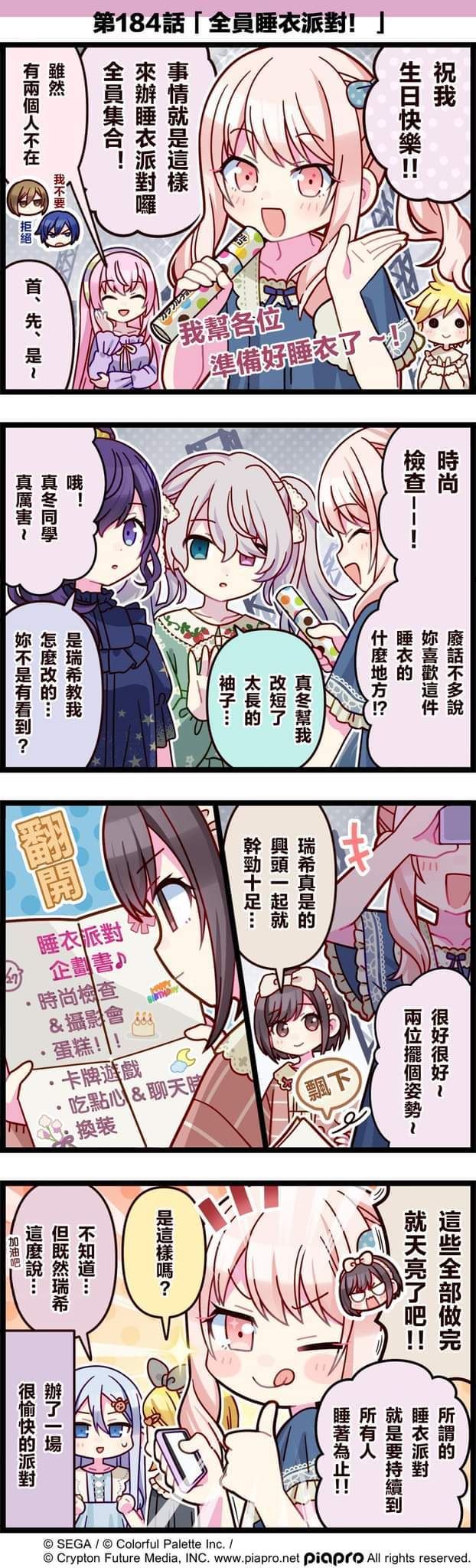 【「世界」劇場 四格漫畫】 尊敬的各位居民:今天8/27是 25點,Nightcord見。成員「曉山瑞希」的生日!讓我們一起來慶祝曉山瑞希的生日吧~來看看關於曉山瑞希、25點,Nightcord見。的成員們與初音未來、巡音流歌、MEIKO、KAITO的小故事吧~第184話「全員睡衣派對!」🎉#PJSK #世界计划 #世界计划 #初音未来 #巡音流歌 #MEIKO #KA