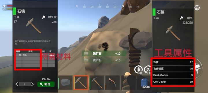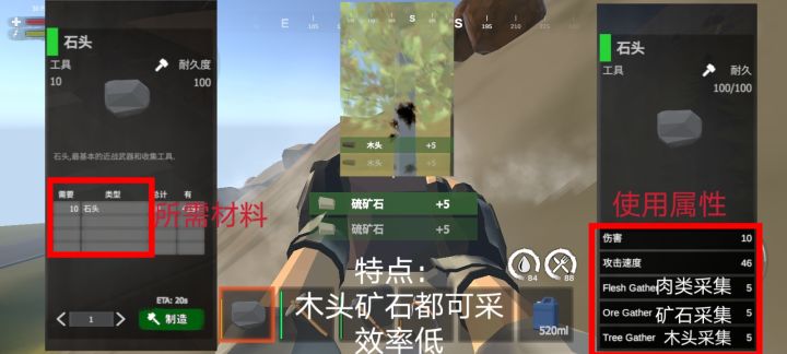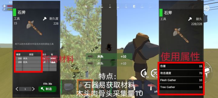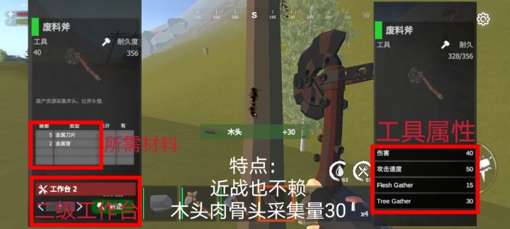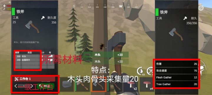 #启示录 #生存 #新手 #工具 采集需要提升效率,工具要升级。全能石头工具什么都可以采,就是效率低;斧子篇:从石斧、铁斧到废料斧,采集效率很明显采集木头、肉、骨头、皮、动物脂肪都是优势树木篇:游戏有大中小树大树500木头中树300木头小树100木头也有树是无法坎动的,是固定场景的,还是bug