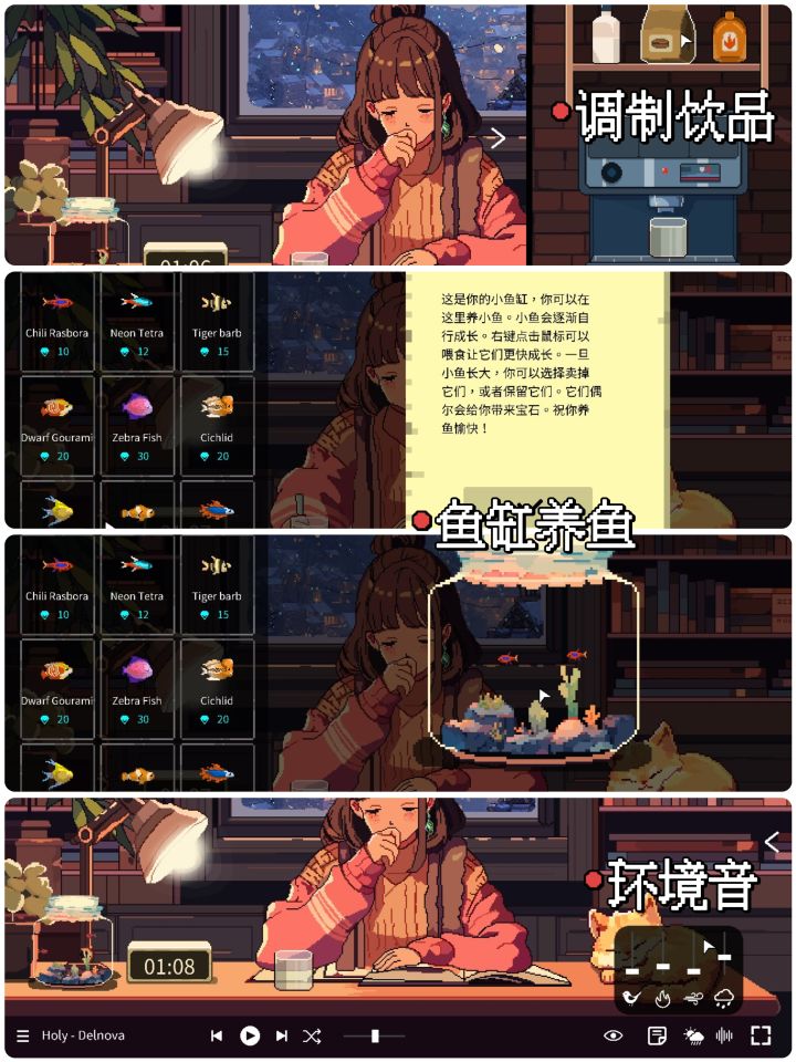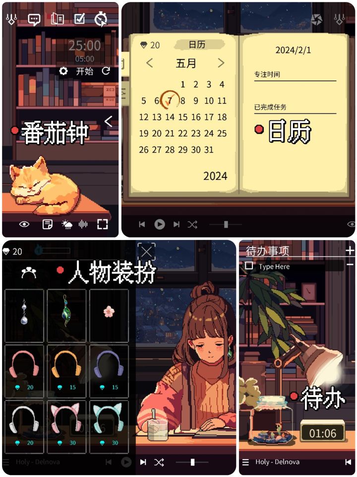 🌠游戏名:Spirit City: Lofi Sessions🌠游戏类型:休闲/音乐/实用工具🌠平台:Steam——⭐4月8日发售的好评如潮小工具,它不单单有常用的待办、清单、番茄钟和习惯打卡之外,还可以收集精灵,打扮角色和布置小屋。买来之后我已经运行了65.3小时,精灵全收集。⭐它真的很治愈,更改环境天气和时间,整体的色调氛围也会随之改变。角色也可以设置在不同的位置,做不同的事,可