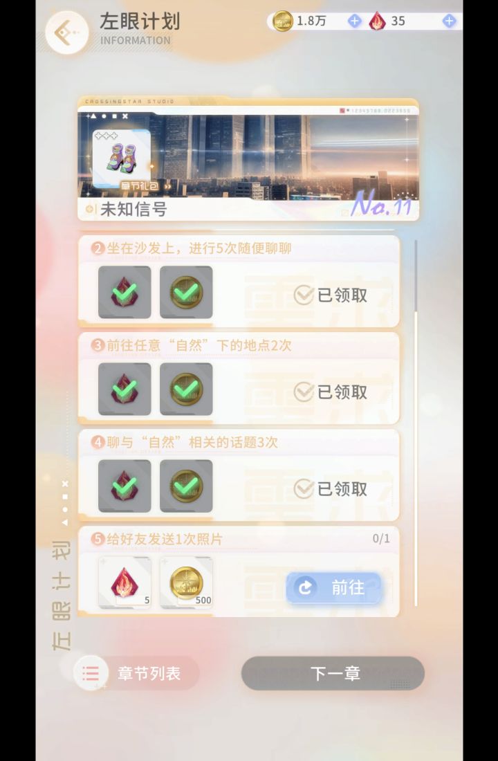 点击前往,找到好友,棕色的那个小点变绿了显示好友在线,给他/她发照片就可以完成啦!!!#左眼计划给好友发照片的任务