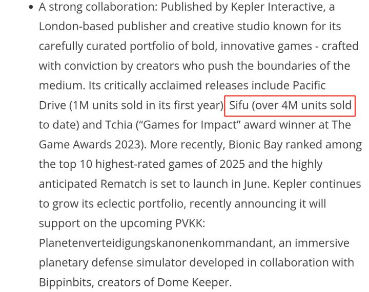 #主机单机 #师父 据法国独立工作室Sloclap报告,动作格斗游戏《师父》全球累计销量突破400万份。 《师父》于2022年2月8日在PlayStation与Epic平台首发,2022年11月9日登陆Switch平台,2023年3月28日上架Xbox与Steam平台。游戏支持中文和粤语配音。 该游戏以中国传统功夫白眉拳为基础,玩家将扮演年轻功夫学徒踏上复仇路,利用功夫技巧和神秘坠饰,在
