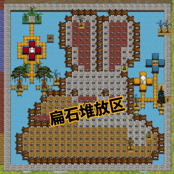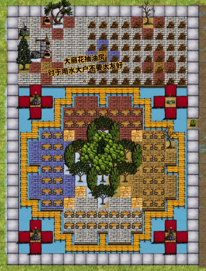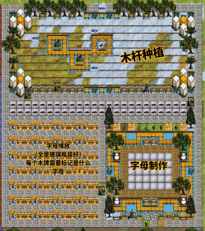 p1是整体大图。由于一直没有更新黑砖导致大拼图边框都是用石板熊皮地板代替或者碎石路,二者一个近距离花眼,一个有缝隙。目前已经完工状态。该建筑是拿来堆积石膏的(右边就是我的染色房内含挤奶机-颜料-牛尿生产-石膏烧制囤积-玉米种植,做的是一体化。)p2是该图右下角埋人区,档猪的木牌(木牌后地板需要打一个木桩猪就不会移动了)上是绝育种子,人可以斜角进去自杀。(国服用不上)箱子我使用的是脱轨轨道车放置铲