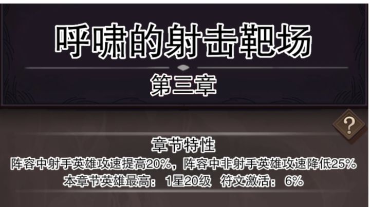 《第三章 呼啸的射击靶场》【章节特性】阵容中射手英雄攻速提高20%,阵容中非射手英雄攻速降低25%【冒险家能力限制】最高等级:20级,最高星级:1星,符文激活(符文加成的生效百分比):6%【Boss关卡(第10关)怪物加成】怪物(敌方)攻速提高30%【推荐英雄或应对思路】本关难点在于刺客偷袭后排。但以目前大多数玩家都采用前后盾的阵容模式来看,这一关反而是最简单的,扛得住第一波伤害