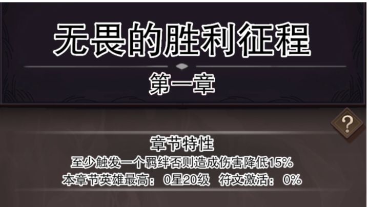 《第一章 无畏的胜利征程》【章节特性】至少触发一个羁绊,否则造成伤害降低15%【冒险家能力限制】最高等级:20级,最高星级:0星,符文激活(符文加成的生效百分比):0%【Boss关卡(第10关)怪物加成】怪物(敌方)获得10%的生命偷取【推荐英雄或应对思路】本关难点在于后期纯白和火男的伤害爆表。所以一定要前中期就结束战斗,而前排又有一个骑士挡道。所以推荐带余烬或者土熊,快速解决掉