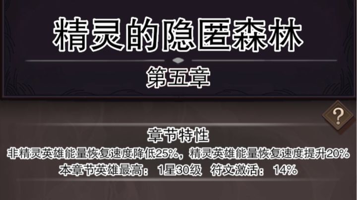 《第五章 精灵的隐匿森林》【章节特性】非精灵英雄能量恢复速度降低15%,精灵英雄能量恢复速度提升20%【冒险家能力限制】最高等级:30级,最高星级:1星,符文激活(符文加成的生效百分比):14%【Boss关卡(第10关)怪物加成】怪物(敌方)能量回复速度提高30%【推荐英雄或应对思路】本关难点双神光搭配加成了55%的高能量恢复速度。所以一定不能发打成持久战,建议多带小体型盾在前排