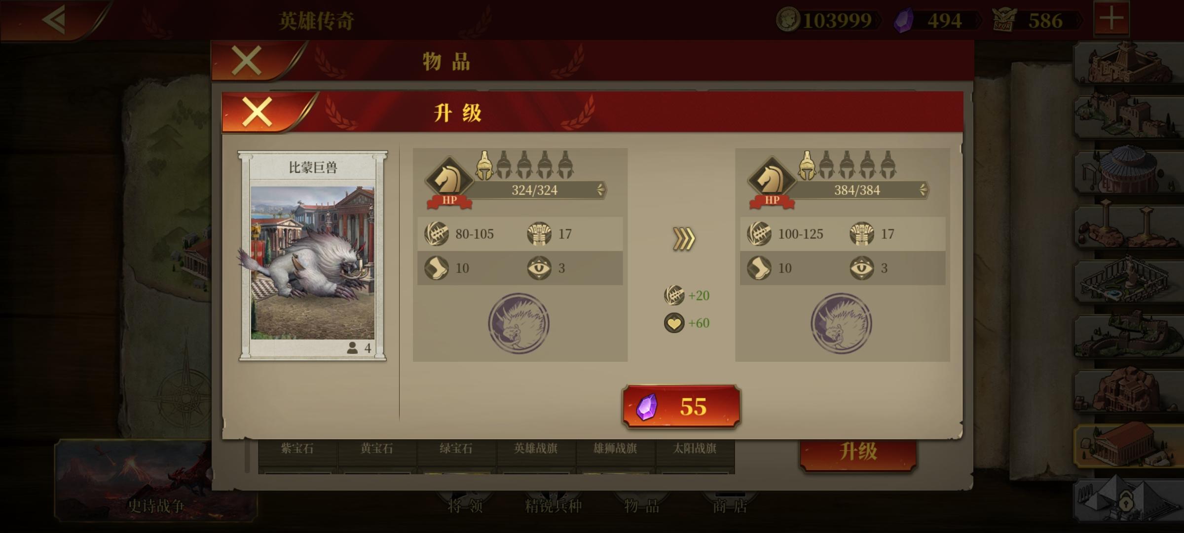 刚刚15回合零血包拿下本关,简要分享一下我的战报。#帝国军团罗马 一,配置如图二三四,零氪最强骑步弓。只召唤了比蒙,其他俩没来得及,用处也不大。二,基本思路红线:维胡子,蓝线:米弓,紫线:比蒙,绿线:骑指。充分运用好对角降士气和骑兵的二连击。1,开局如图一围住波斯将领大象,群殴。2,第二回合,火龙上来打蛮族勇士。打完波斯将领大象后,第三回合,米弓连击火龙,没有连击就急行军刷。3,第