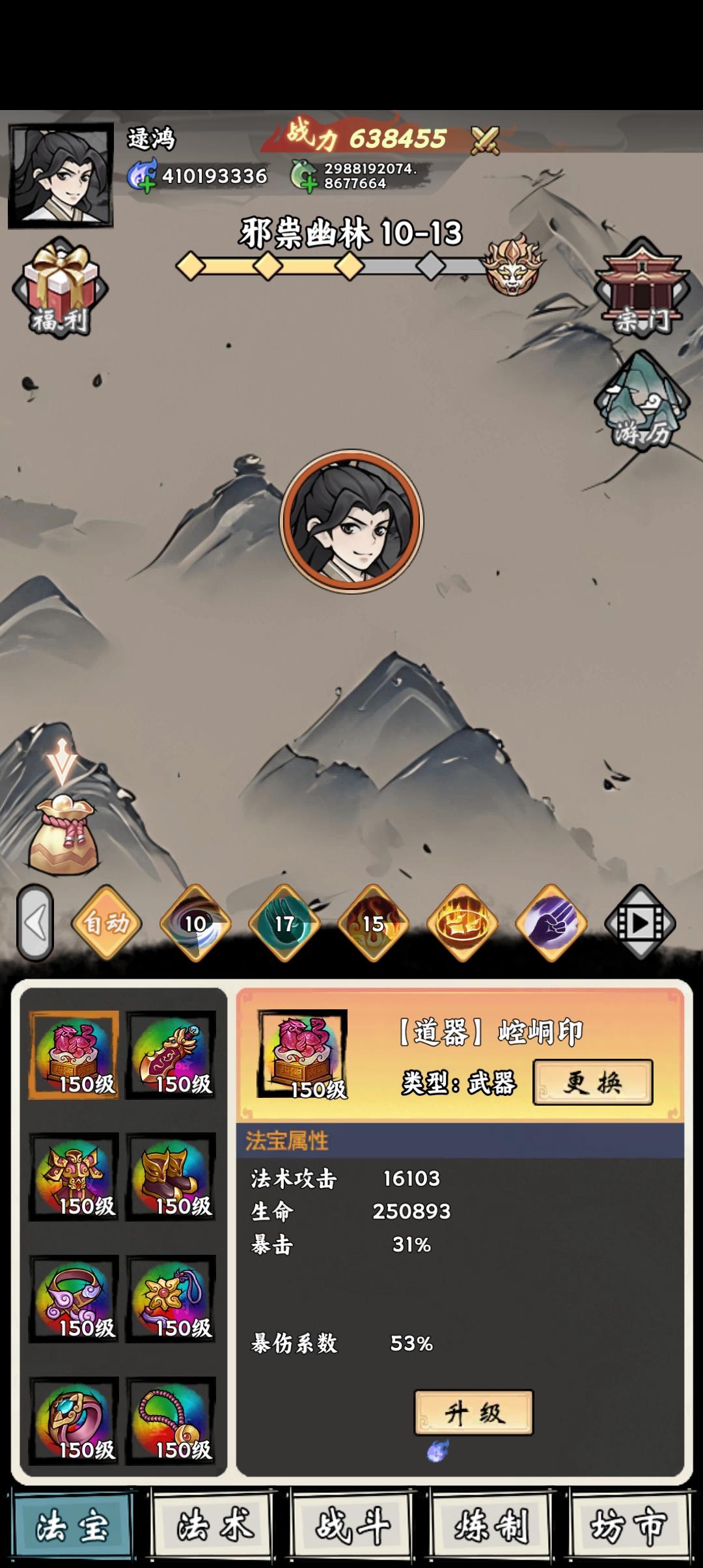 (只适用于大大大大…后期) 流派∶吸血闪避流 功法∶星华换髓录,星尘宿劫录,星渊灭灵录(均为 乾阶) 天赋∶混沌魔祖,焚香首席,任意红灵根 法宝∶鼎,剑等(如图) 助阵弟子∶均为火灵根(因为技能都是法伤) 法术∶五灵诀,皇极印,焚天祭火,寂灭指,火炎莲,紫炎鸣(还有一个神技∶破岳击) 战力 拉满就100w出头,但不是上述配置,吃四品丹药理论上可以继续无限加战力,但没必要。 历练目前共七个副本,前五