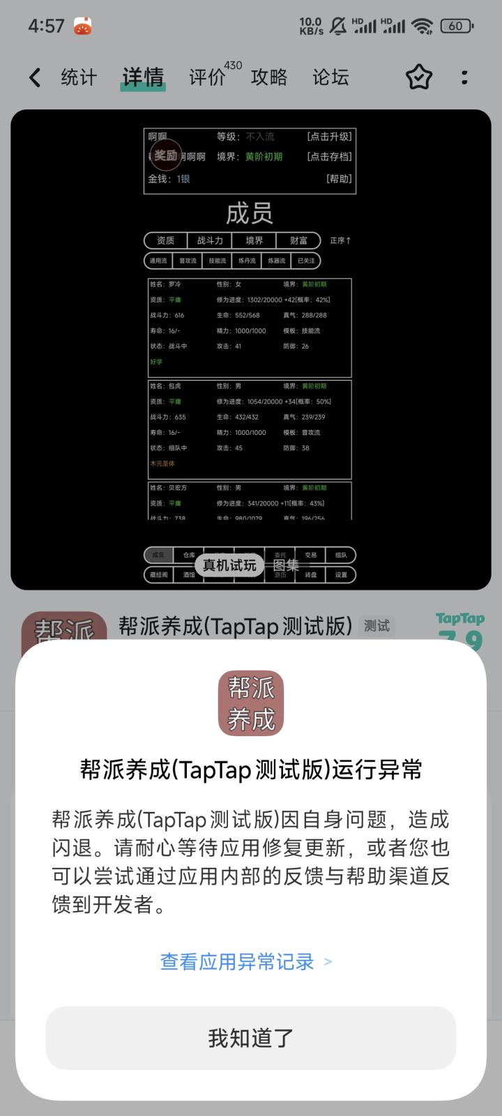上次更新,旧档废掉,然后开新档所有角色闭关修炼。这次更新,玩都不让玩了是不?#帮派养成TapTap测试版