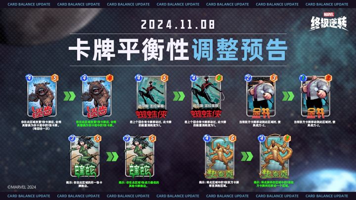 各位探员,为了保持竞技游戏的平衡性,我们会根据卡牌在游戏环境中的胜率和使用率进行定期调整,以让长期被忽视的卡组有机会重现辉煌,为玩家打造一个多样化且稳定的游戏环境。本次平衡性更新预计将于11月8日进行,玩家更新客户端后方可生效。此次我们对以下卡牌进行了加强:锁齿、迈尔斯‧墨拉莱斯、金并、蝰蛇、史泰贡,详细调整如图所示。#漫威终极逆转 #漫威 #平衡性调整