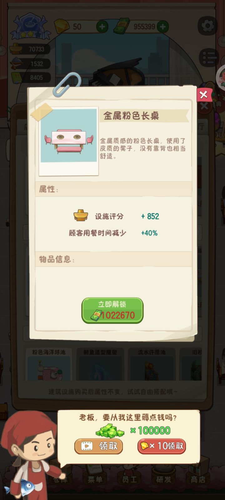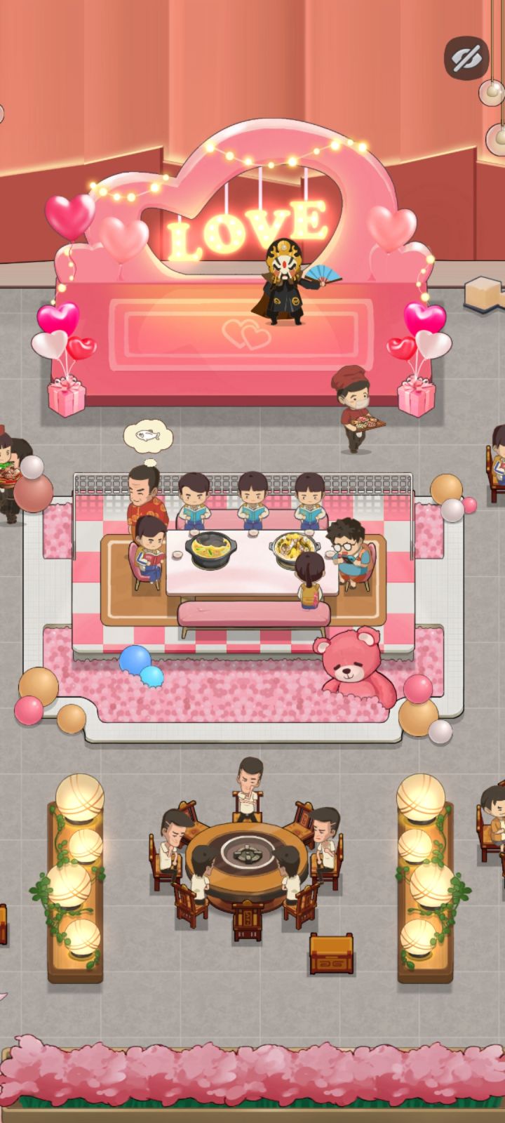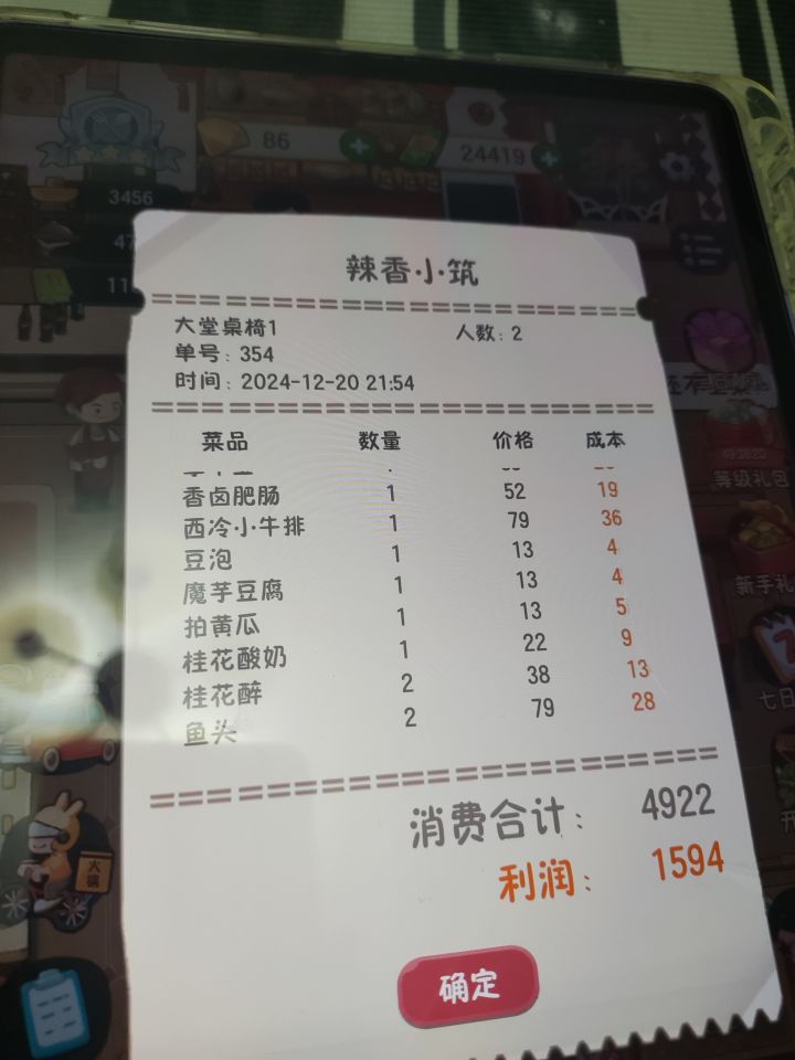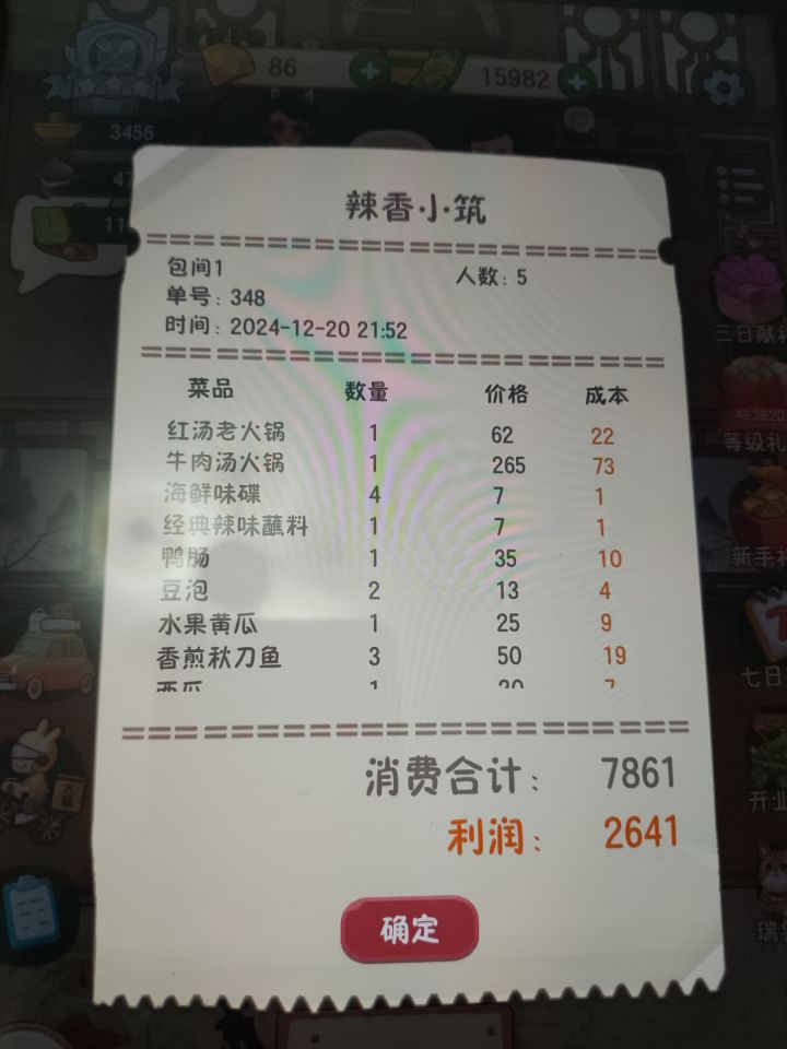 四天了,收集癖肝累了,麻了,一套桌椅一百来万,利润也少,你个演艺厅钱还收那么少!钱都不够买物品了,bug广告看完了还不给钱,白嫖啊?破广告烦死了!!还有那端锅的摸鱼!!!我锅底都满了还不来端!别人菜都上了,锅底还没有上,那管包间的小刘每次不知道死哪去了,都是王姐去点单,累了肝不动了…#幸福路上的火锅店