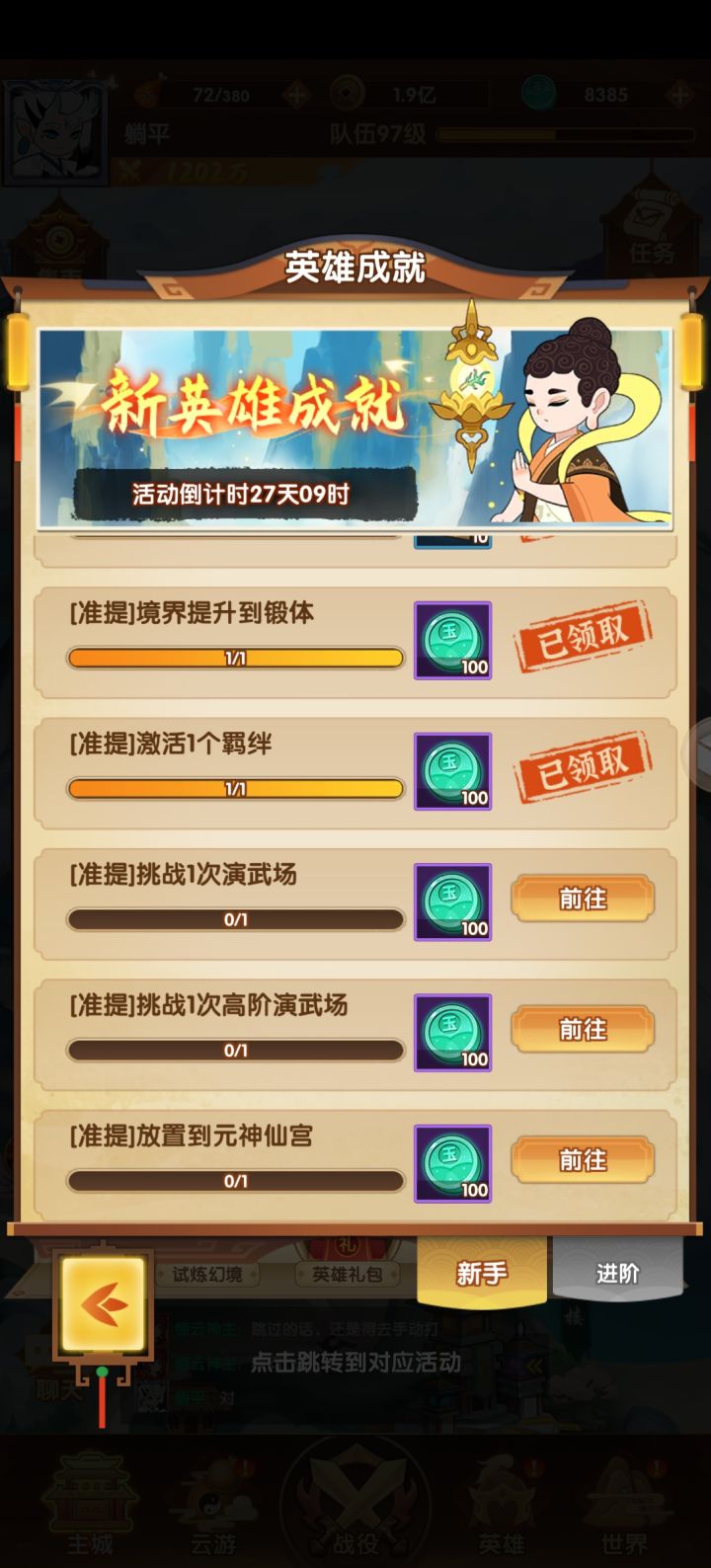 新英雄【准提道人】如约上线,初看技能感觉这个英雄有的玩,阳系一直缺乏强力的法术输出英雄,准提的技能机制可以打出成吨的伤害,那么就阵容搭配以及注意事项做一个细致解说。 【阵容搭配】 输出:准提道人;辅助:兔子、云霄/桃子、多宝 ;肉盾:金灵圣母; 【神器】九黎壶 【专属】20+ 、30+ 【开局攻略】 目前新区几乎每隔一天开一次,建议早上7点的服,9点前进入会多得20召唤卷,可以多备几个号刷一下初