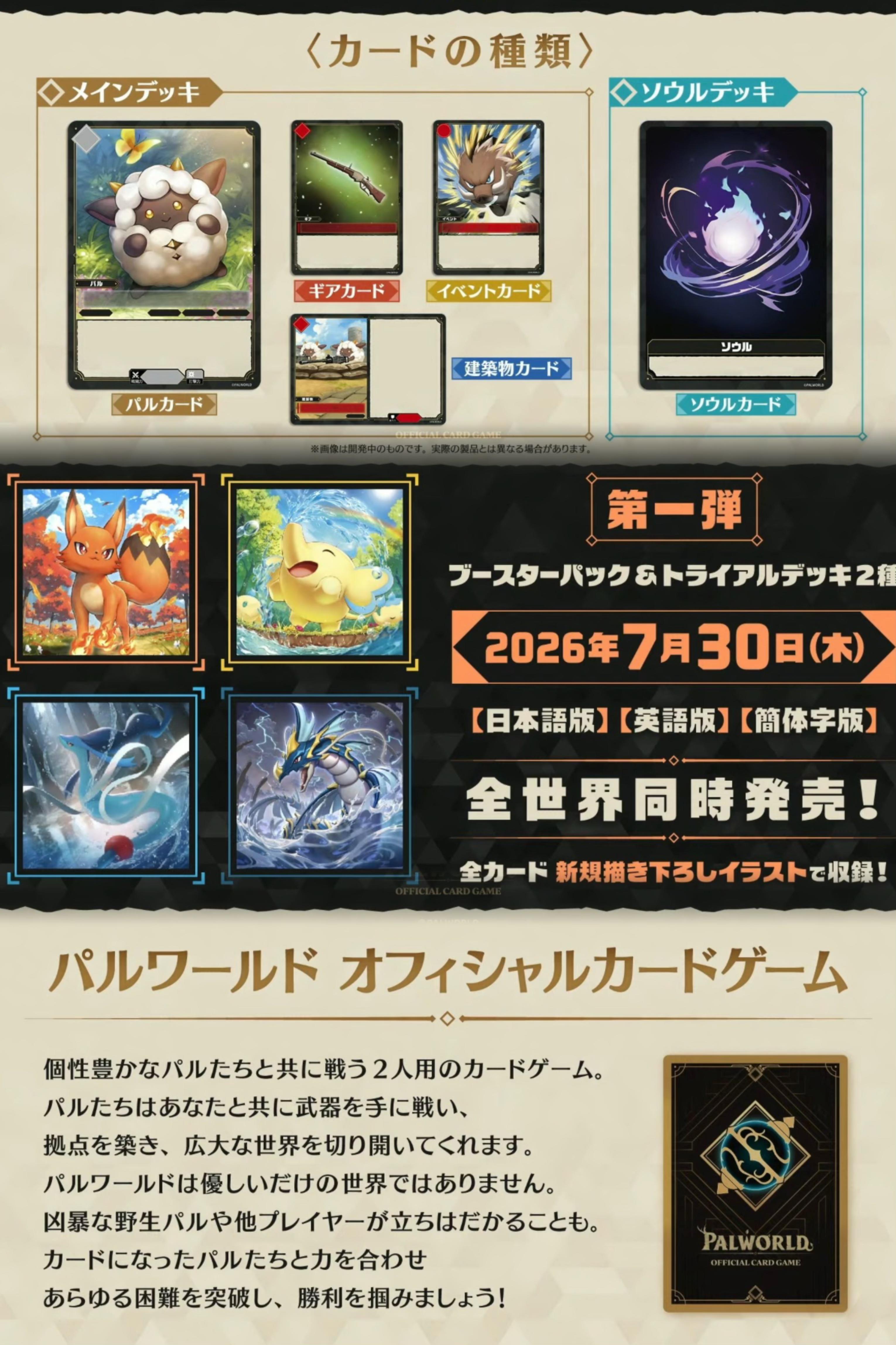据GameWatch报道,知名娱乐公司武士道正式官宣,将推出《幻兽帕鲁 官方卡牌游戏》,这款基于热门生存动作游戏世界观的集换式卡牌(TCG),定于2026年7月30日全球同步发售,首发即涵盖日文、英文及简体中文版本。游戏主打双人对战玩法,玩家将与帕鲁并肩作战,目前已确认卡牌类型包括帕鲁卡、装备卡、事件卡、建筑卡和灵魂卡(暂译),详细规则暂未公布。首弹商品包含补充包与两种试玩入门卡组,所有卡牌均采
