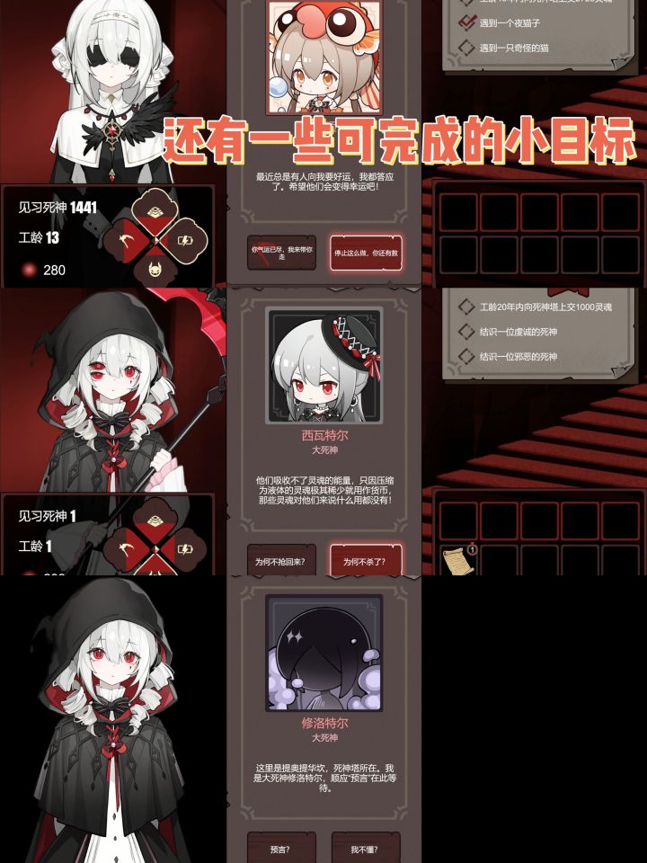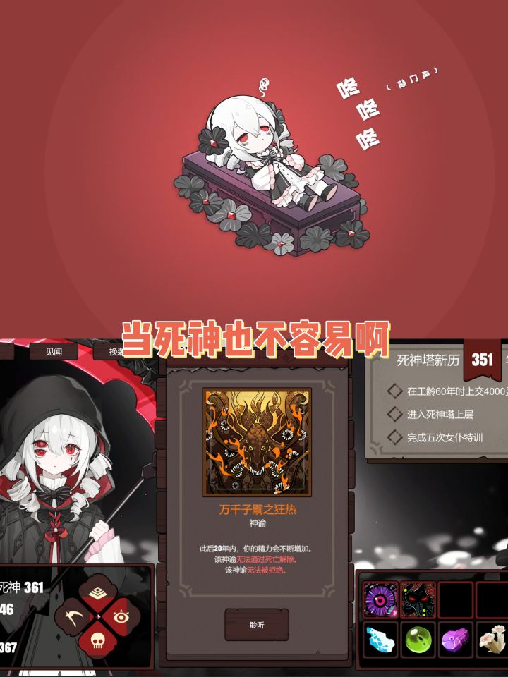 🎮游戏名🔺Trainee Death Simulator🎮游戏类型🔺角色扮演🎮平台🔺Steam/移动端🎮状态🔺steam可试玩——🔅人气游戏《犹格索托斯的庭院》衍生作品。🔅玩家扮演一名需要收割灵魂的小死神,你需要在海量随机事件中做出判断,收割还是不收割?🔅你还有kpi指标需要达成,这年头死神也不好当啊。🔅也可以收集好看的套装,部分套装可以把头发和衣服拆开混搭。——📣记得点击下方