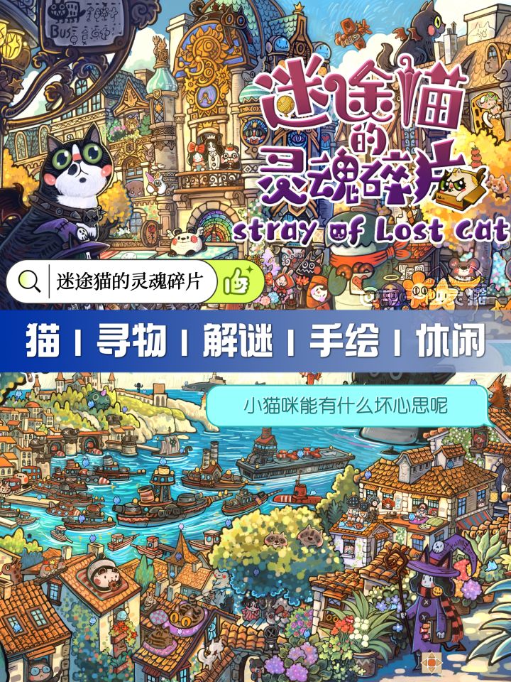🎮游戏名⚫︎迷途猫的灵魂碎片🎮游戏类型⚫︎寻物/解谜/手绘🎮游戏状态⚫︎可预约(点击最下方游戏标签右侧“预约”,即可在游戏上线第一时间收到通知( ⌯' '⌯)📣)——🍀听说猫有九条命,而本作的主人公就是一只即将逝去第九条命的小猫咪,为了继续吃到铲屎官新买的小零食,毅然的踏上了寻找灵魂的旅途。🍀收集灵魂碎片,躲避喵迪斯的追捕。🍀场景丰富,昏晓制敌、迷离之森、梦晓小镇……🍀旅途中,小猫