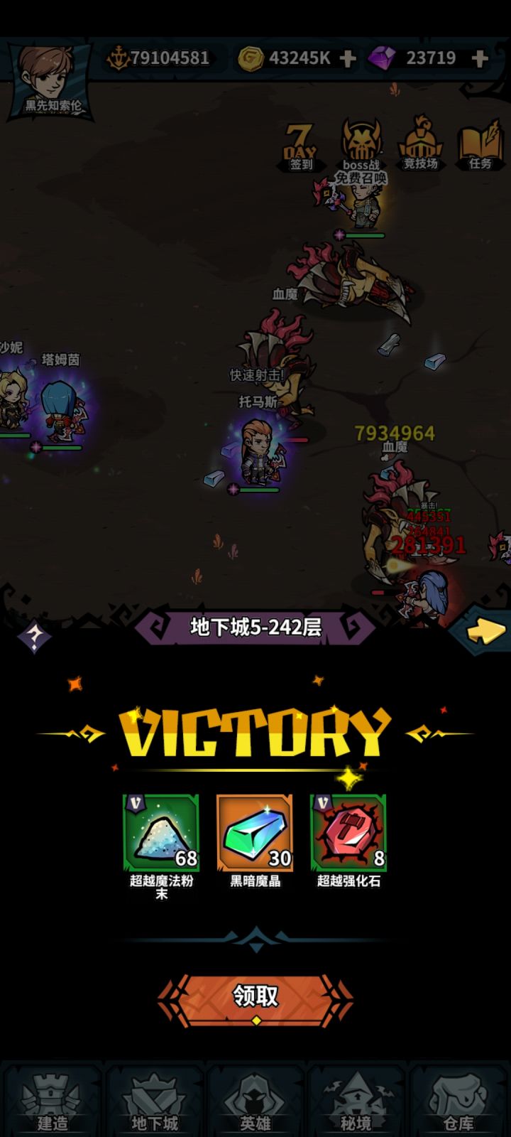 如题,242通关之后只能反复刷242了,后续关卡没开。双榜战神1,后面还能到战神3,但是积分需要太多,慢慢养老打了,反正阵容成型,随便打。图鉴全齐了,目前7个彩。用时五天,算是通关了。附毕业阵容:前排:圣光战神、魔焰斗士后排:疾风尊者、审判天使、圣光祭祀#2022 TapTap 年度游戏大赏#攻略#游戏讨论#庆祝通关#阵容搭配