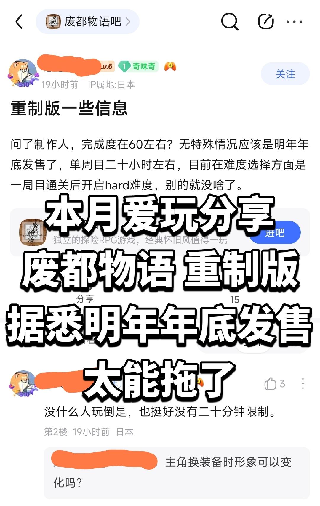 废都物语 重制版明年年底发售信息源自霓虹ip网友透露,具备一定的可信度制作组效率不太高的样子游戏内容单周目耗时20小时左右,内容量较为夸张原作者或许在重制版中加入了大量的合理的扩充内容例如角色单线角色单线特殊结局啥的#主机单机 #资讯评论员 #游戏资讯 #废都物语