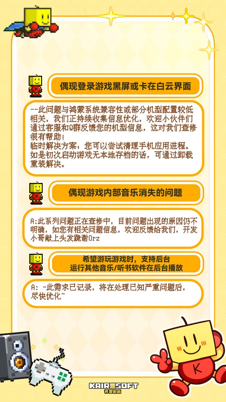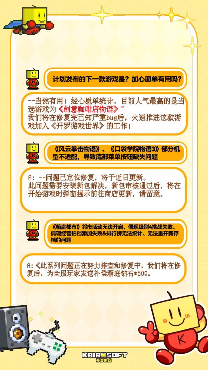 欢迎来到《开拍!小队加班日记》第二话! 各位小伙伴们晚上好呀,这里是开罗运营小队!《开罗游戏世界》公测5天以来,我们接收到了很多小伙伴的支持和问题反馈,非常抱歉给大家带来了不好的体验,小队将抓紧时间,依次尽快解决~~问题逐个修复和排查需要一些时间,感谢小伙伴们的谅解与耐心等待。具体问题在图上,感谢小伙伴们的支持!#开罗游戏 #开罗游戏世界 #今天游戏圈发生了啥 #发现好游戏 #开罗君 #
