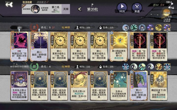 #弈仙牌 #弈仙牌攻略 #弈仙牌黎承云 #弈仙牌残局 在弈仙牌的游戏中会遇到一个难以计算的对局,狂剑对战回响反震。很多道友在实战中很难找出解法,也可能陷入诸多误区,最典型的便是黎承云连环月影。 如上图的例子,在有狂零的加持下,黎承云每一次使用云剑月影,会使得每段攻击多造成4伤,并回复3.2血(最后累加的结果向下取整),共带来每次攻击7.2血量差的收益。而每一次回响反震,会带来每段攻击4血量差