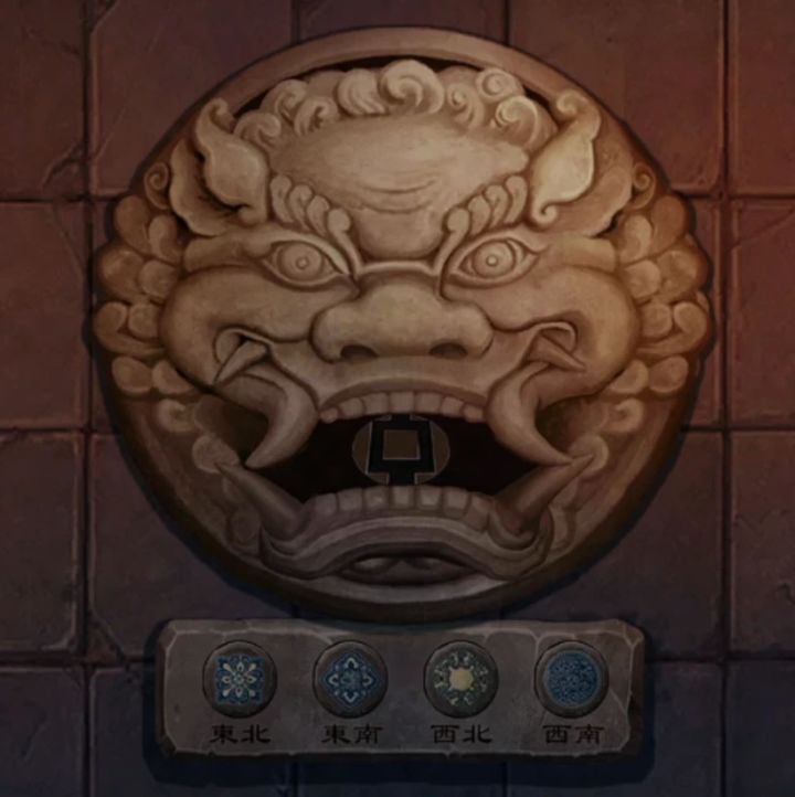开局讨债~查看一下右边的灯笼,记一下上面写的是什么,左边石狮子调查一下提示可以移动,再点一下就能移动了,查看一下墙上的对联,春寅卯辰,夏巳午未,秋申酉戌,冬亥子丑,那么震=寅=春,离=巳=夏,乾=申=秋,坎=亥=冬。再看一下石狮子的线索,随便点一个发现移动开之后下面是节气,左上立春右上立夏左下立秋右下立冬,换成八卦的话就是左上震、右上离、左下乾、右下坎,调整完毕后右边的水壶机关开启。查看一下每
