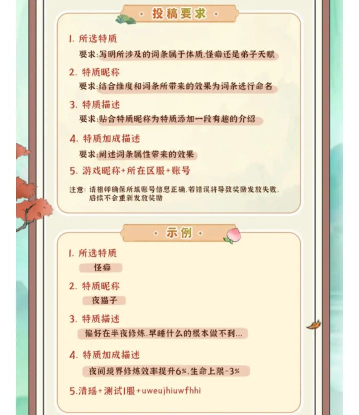 #弟子词条共创 所选特质怪癖特质昵称一挑五特质描述队友活着影响我输出啊特质加成描述当成为己方唯一存活目标时,免疫所有控制并且造成伤害额外加成15%,但是防御降低30%游戏昵称:独钓寒江雪大区:天火灵域6服id:n7ojtej02d00